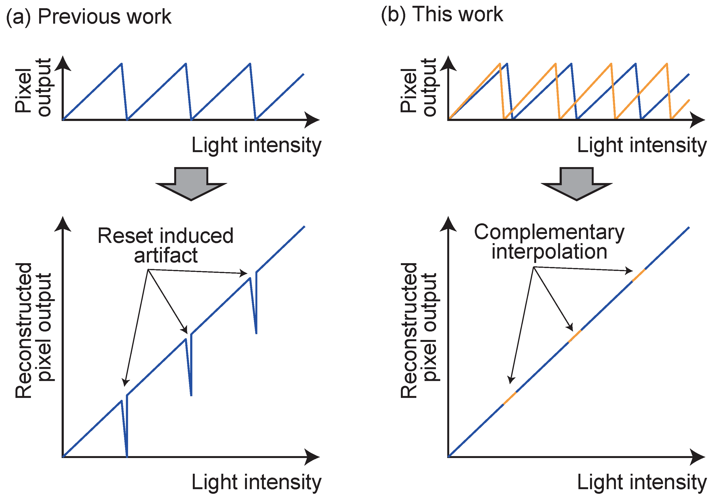 - A robust off-chip reconstruction framework incorporating FPN correction and a minimum frame-to-frame difference algorithm to restore highly linear images.