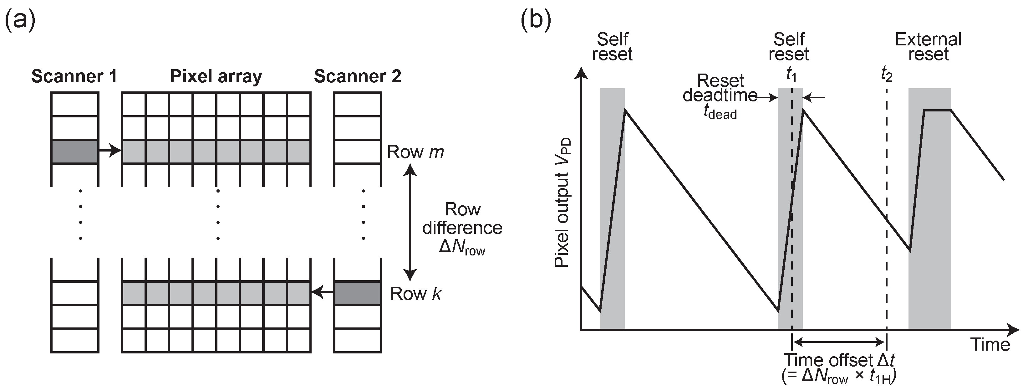 - A novel readout architecture that achieves non-destructive interleaved sampling with a time offset using two row-selection scanners, significantly reducing reset dead time artifacts.