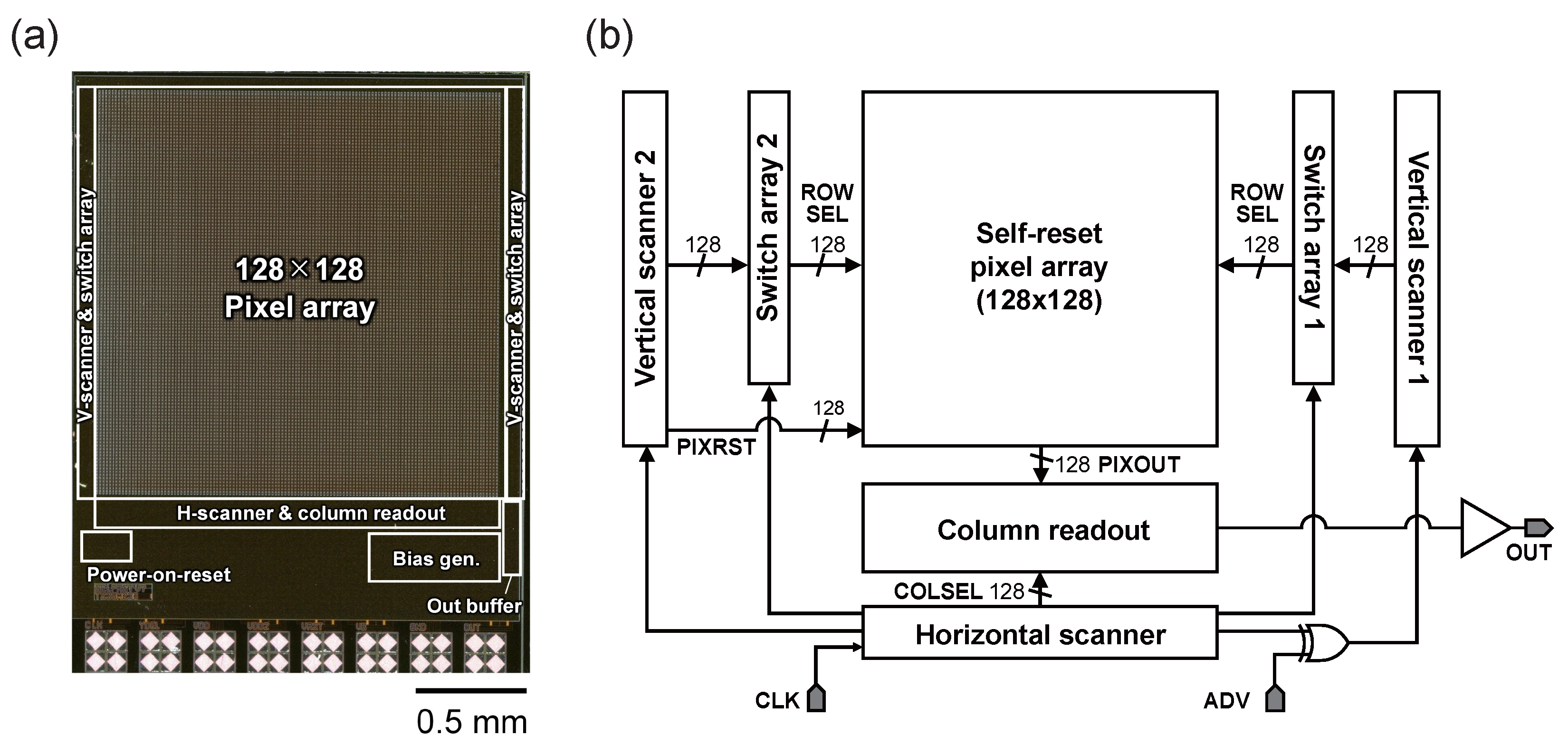 - A pixel circuit combining a standard 3T structure with an in-pixel Schmitt trigger self-reset circuit for stable asynchronous operation.