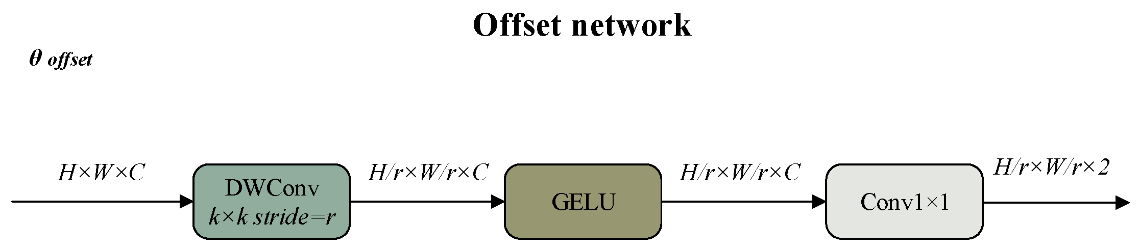 Figure 1. The input features first capture local spatial information through a 5 × 5 depthwise convolution. After introducing non-linearity via the GELU activation function, a 1 × 1 convolution outputs 2D offset vectors. To avoid forced global offsets, the bias term of the 1 × 1 convolution is specifically reduced to ensure the adaptability and stability of the offset generation, while matching the characteristic that reference points cover a local s × s region.