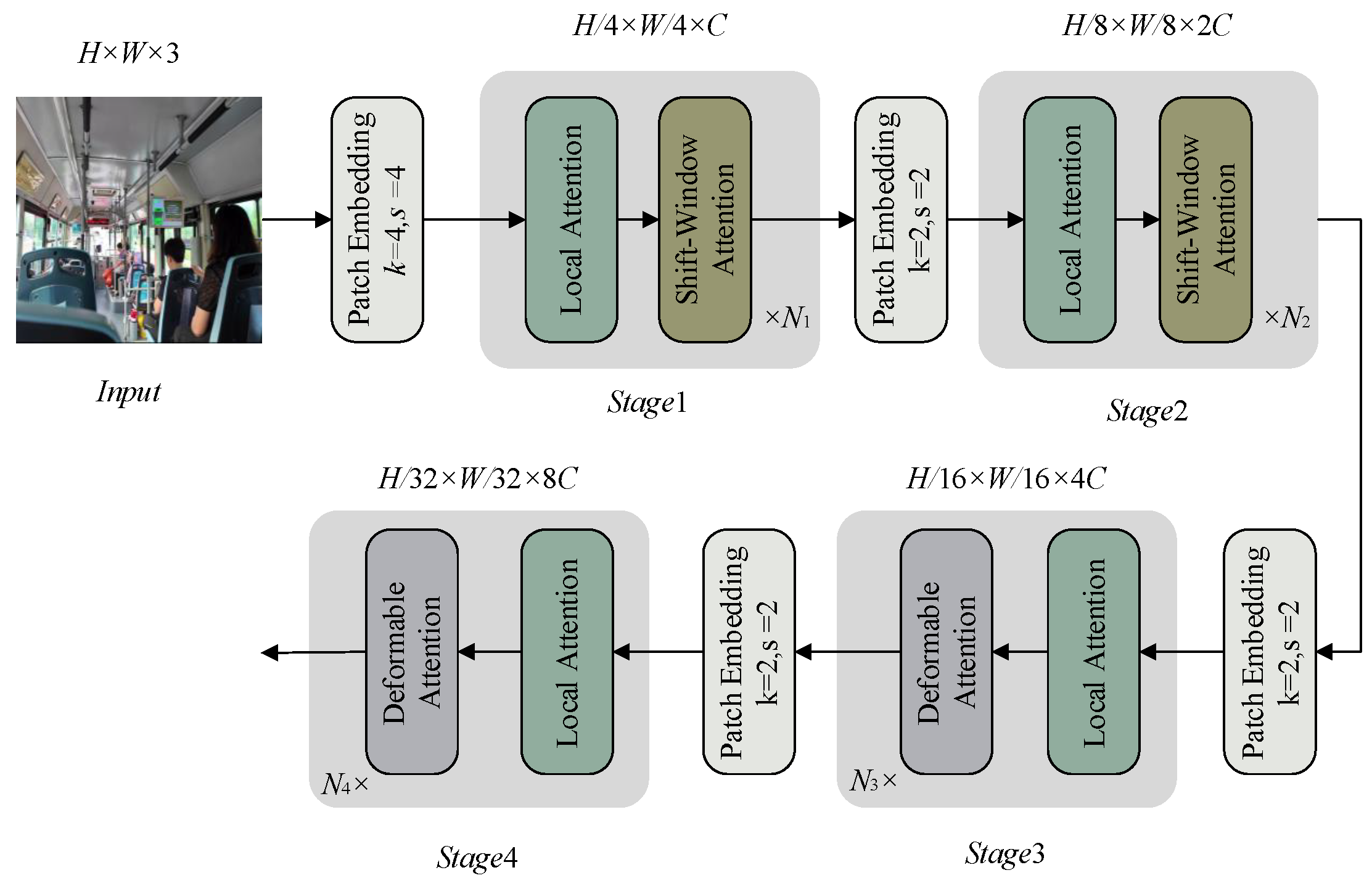 To address bus scenarios’ enclosed space, high passenger density, and frequent occlusions, DAttention is specifically designed to tackle occlusions: it generates unified grid reference points and dynamic offset vectors via a lightweight sub-network, focusing on key target regions; it uses bi-linear interpolation for feature sampling at deformed points to capture incomplete features of occluded passengers; and it incorporates a deformable relative positional bias to enhance spatial dependency modeling, facilitating differentiation between occluded targets and background interferences.