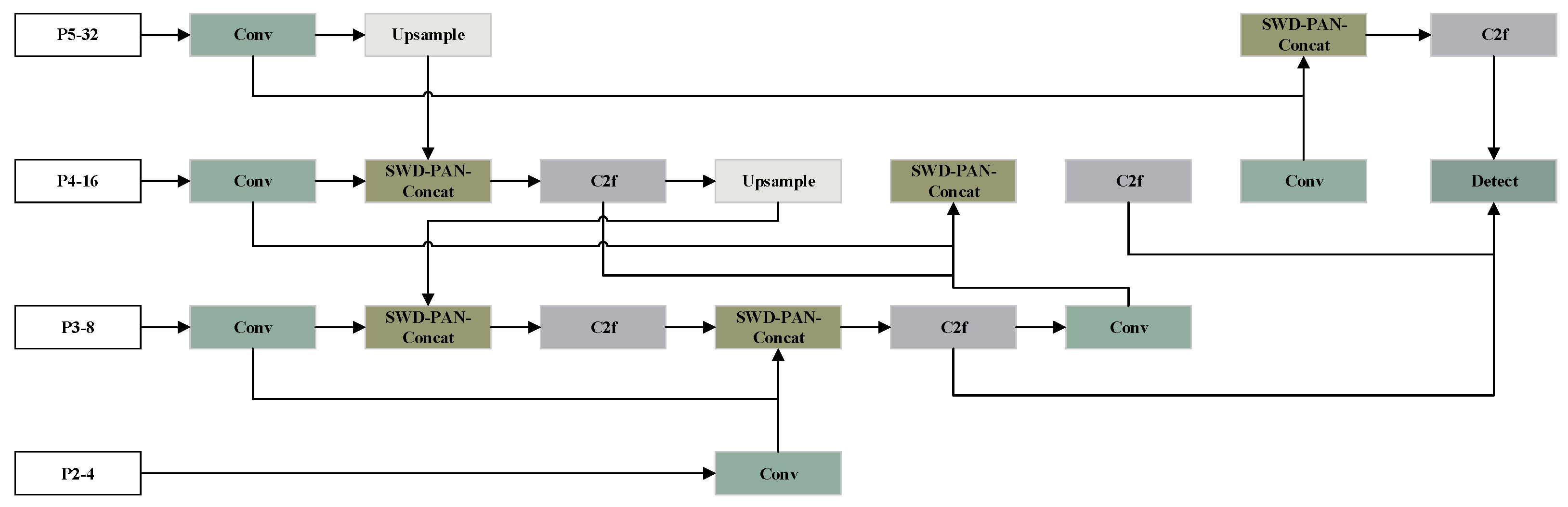 are the features of the top-down and bottom-up paths, respectively. This formula embodies bidirectional transmission, weighted adaptation, and multi-scale integration, consistent with the structural design of SWD-PAN.