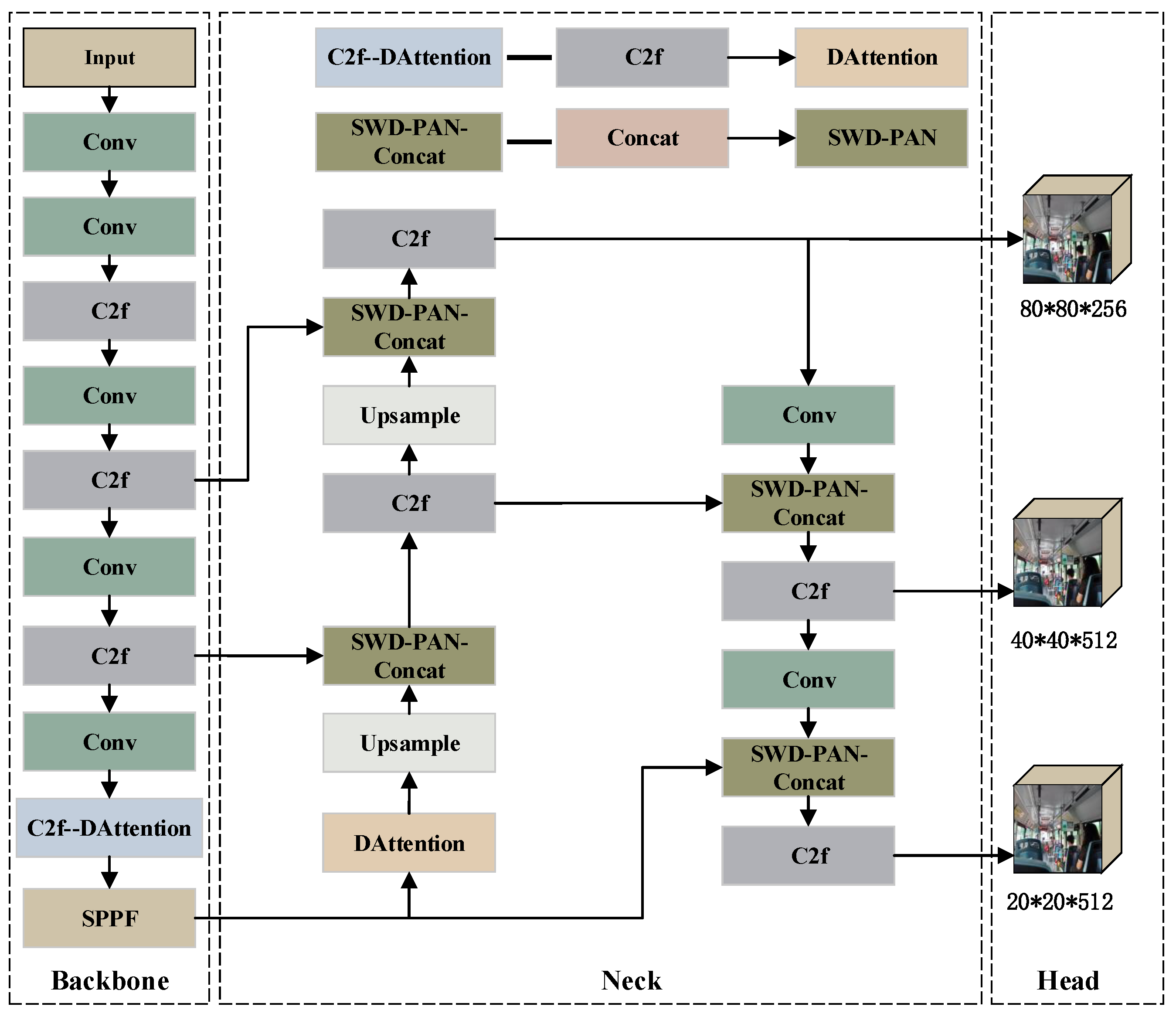 Figure 4. The core achieves a leap in bus passenger object detection performance through the full-link collaborative design of “feature extraction-feature fusion-loss optimization”: the DAttention mechanism is embedded in the Backbone and Neck modules, which are deeply integrated with the C2f module to construct the DAC2f structure; the Neck module adopts the SWD-PAN network to enhance multi-scale feature fusion; and the WIoUv3 loss function is introduced into the entire network to optimize detection box localization.