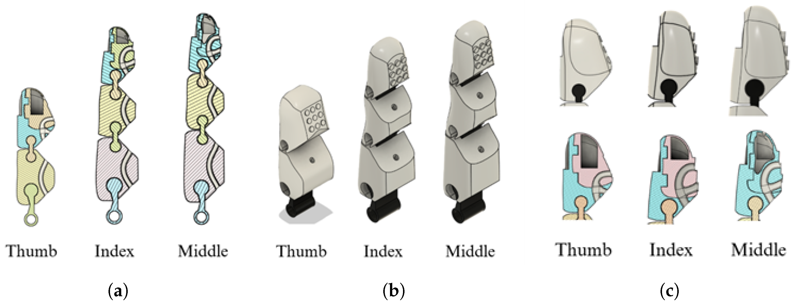 23]. These dimensions were subsequently adjusted based on real anthropometric measurements, allowing for the morphology to better reflect characteristics representative of the target user population. This process highlighted morphogeometric differences between populations and underscores the importance of regional adaptation in prosthetic design. The resulting prosthesis achieves a balanced integration of functionality, structural simplicity, and visual realism, including details such as palm curvature, fingernails, and fingertip geometry, which are important factors for user acceptance.