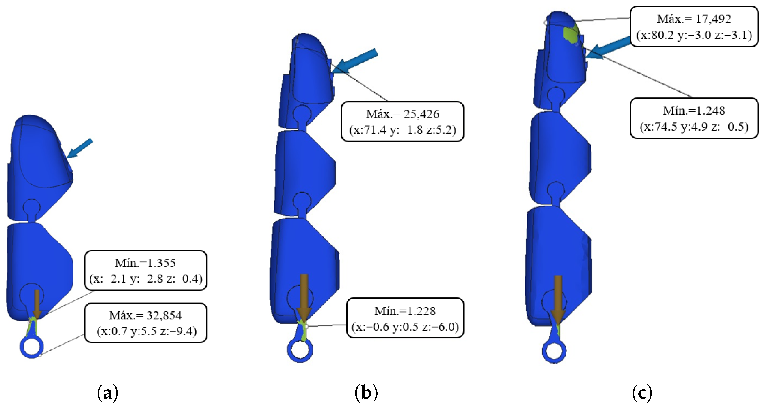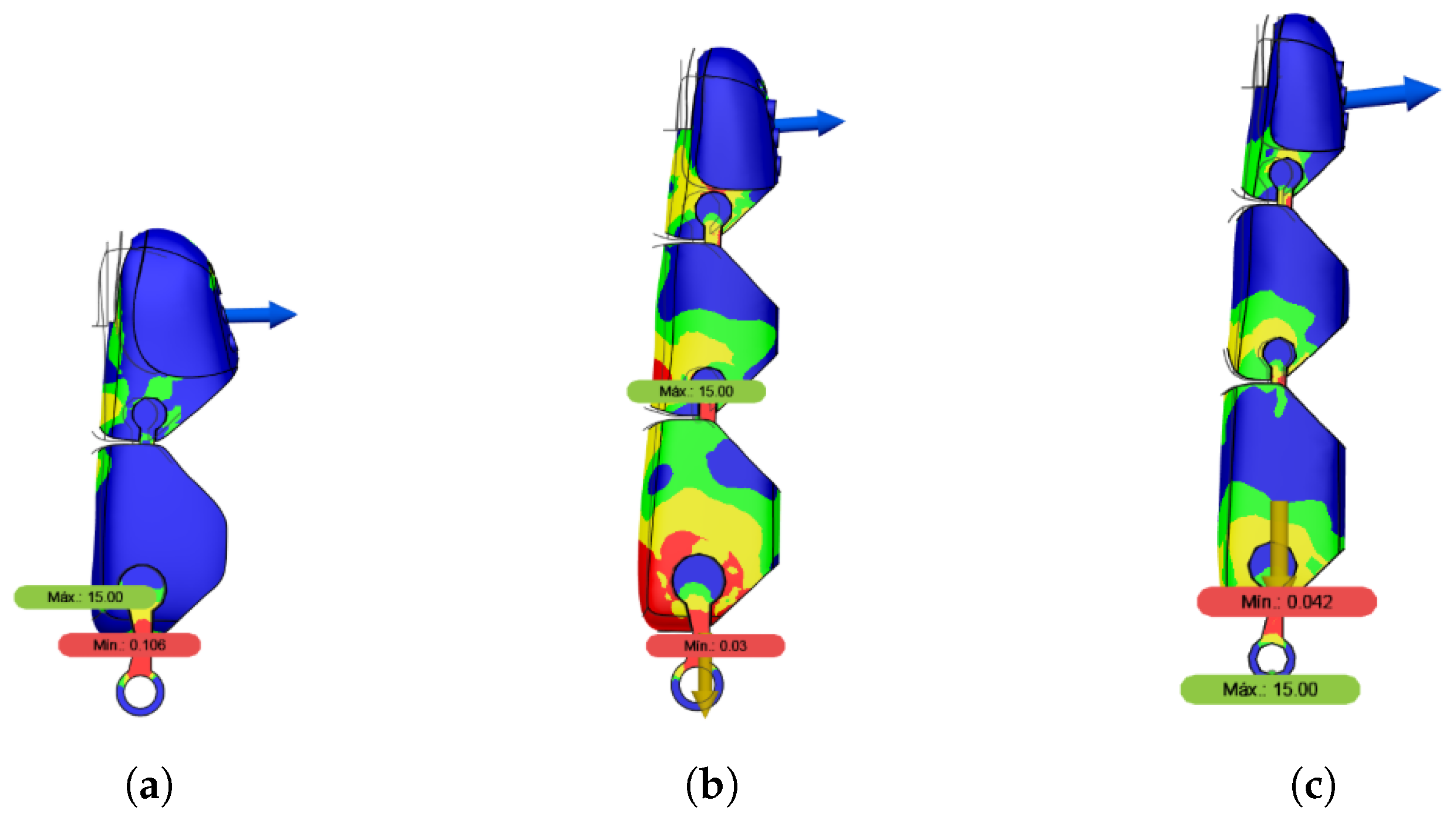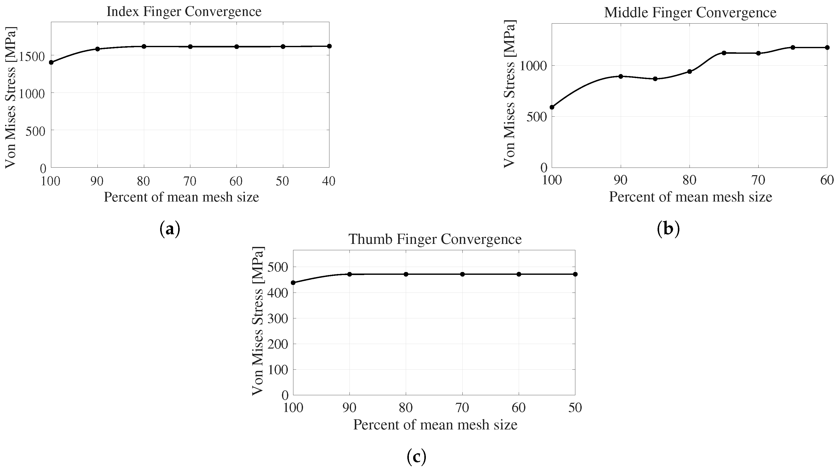 Although the mechanical analyses indicate that the prosthetic structure can withstand a load of 26.9 N when considering the combined resistance of the fingers in the tripod pinch configuration, the effective gripping force is ultimately limited by the actuator torque. Experimental evaluations revealed that, due to transmission losses and the selected motor characteristics, the maximum force actually achieved by the prosthesis during the tripod pinch gesture is approximately 3.83 to 4.23 N. This confirms that, in the current prototype, the operational force range is constrained by the actuation system rather than by the structural resistance of the fingers.