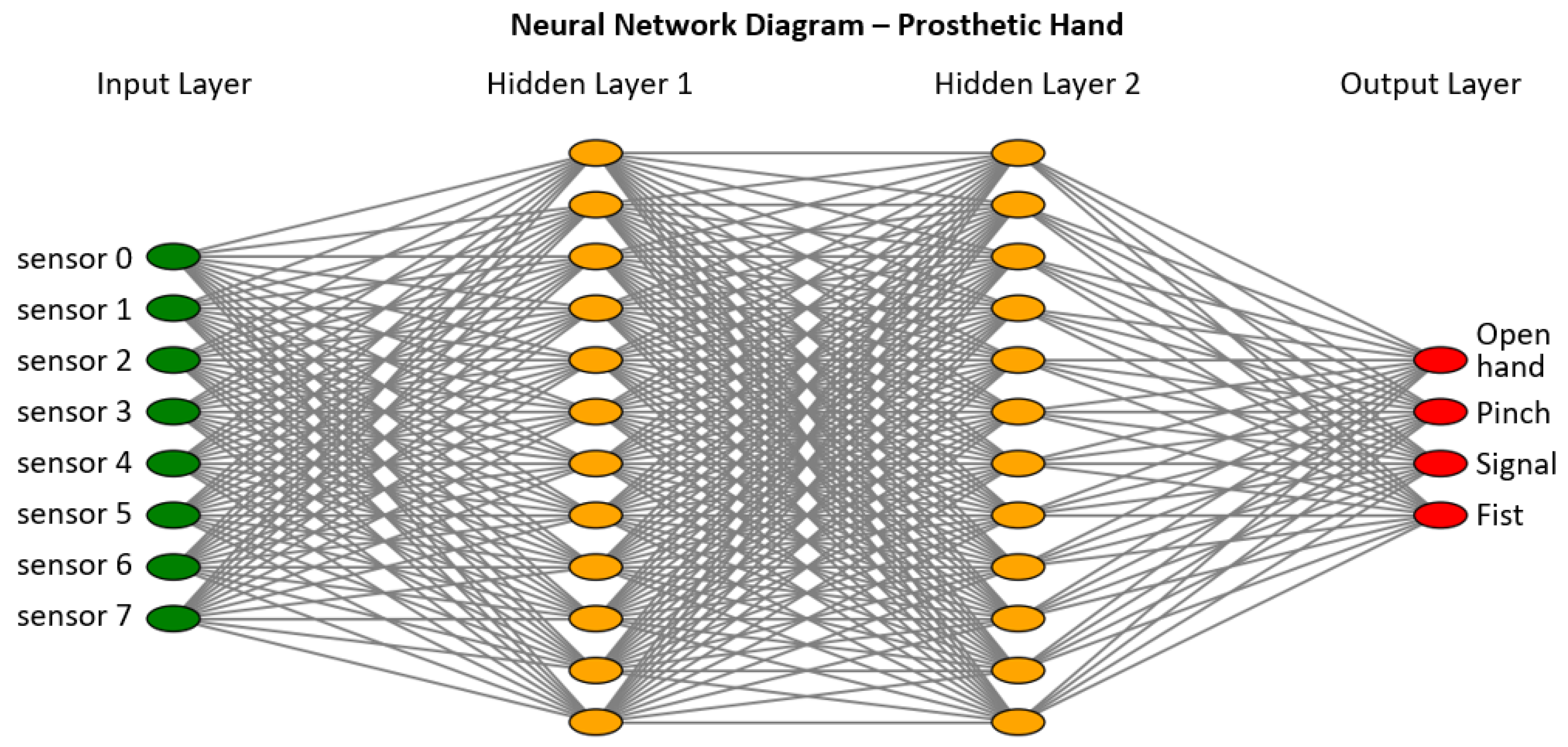 Based on this context, it is evident that there remains a need for soft hand prostheses that balance mechanical compliance, structural robustness, aesthetic integration, and low-latency myoelectric control within resource-constrained embedded systems. The main contributions of this study can be summarized as follows: (i) the design of a soft, tendon-driven prosthetic hand that enhances passive grasp stability through textured finger surfaces and internal vacuum-based reinforcement, without relying on additional force or position sensors; (ii) the implementation of a lightweight fully connected neural network (FCNN) optimized for execution on a low-power microcontroller, enabling end-to-end myoelectric control with experimentally measured response times on the order of one second from EMG activation to physical motion; and (iii) an experimental evaluation aligned with the binary deployment of the system (open hand versus tripod pinch), including quantitative analysis of response time, grip success rate, sustained grasp behavior, and false activations during grasping tasks involving everyday objects.