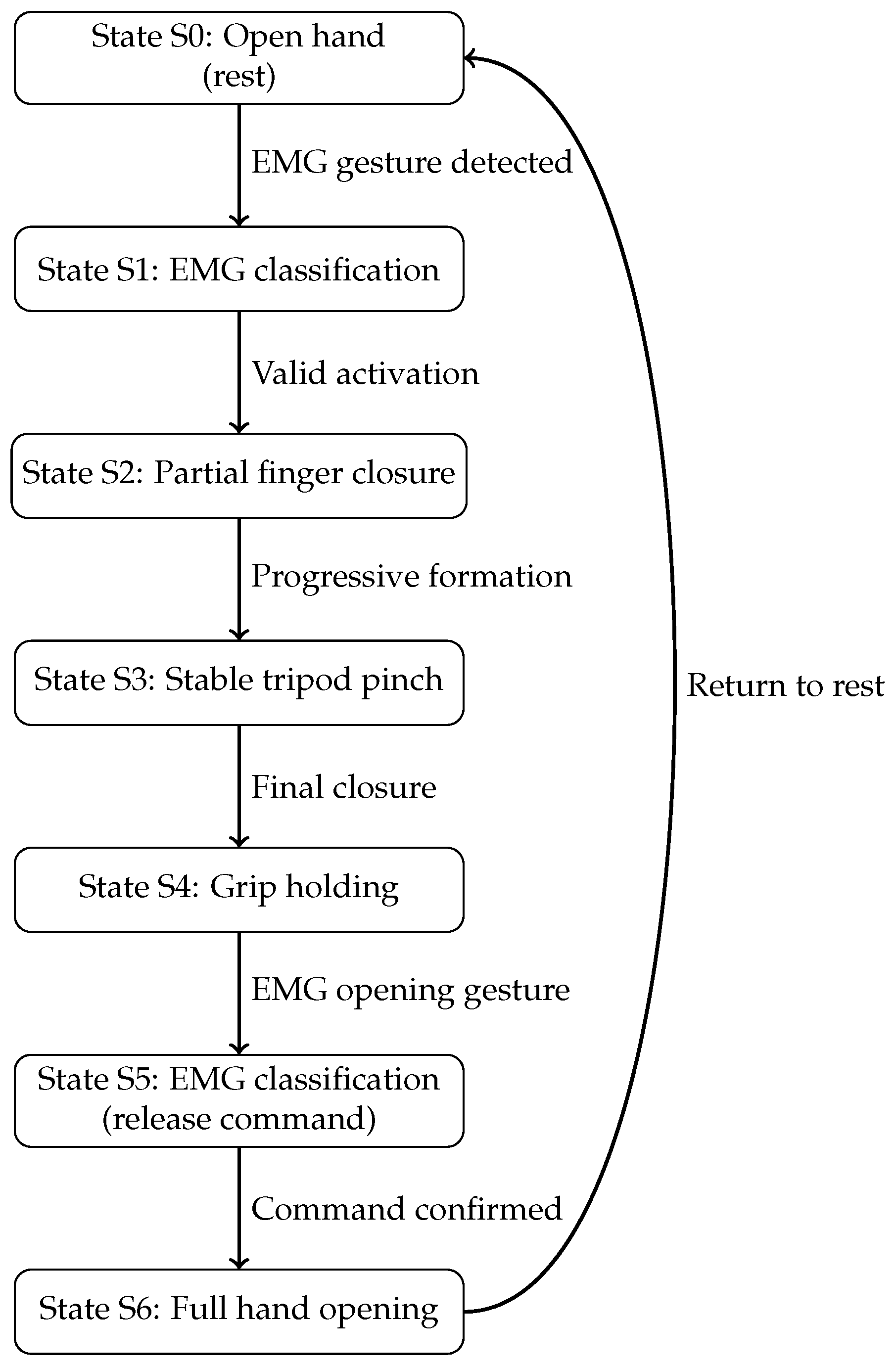 This design choice reduces system complexity and cost while maintaining sufficient grasp stability for fine motor tasks, making the prosthesis particularly suitable for assistive applications and resource-constrained contexts. However, this approach is not intended for tasks involving heavy objects or high gripping forces.