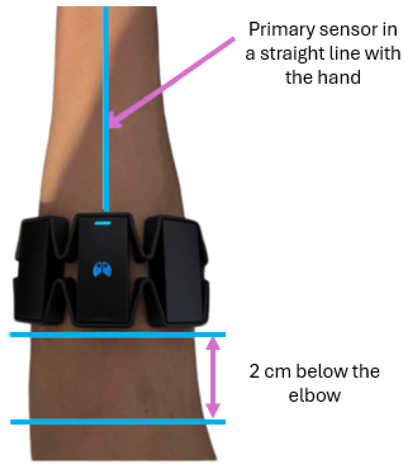 Myoelectric signals were acquired using a wearable EMG armband positioned on the right forearm, approximately 2 cm below the elbow, while maintaining a consistent orientation of the main reference sensor, as illustrated in