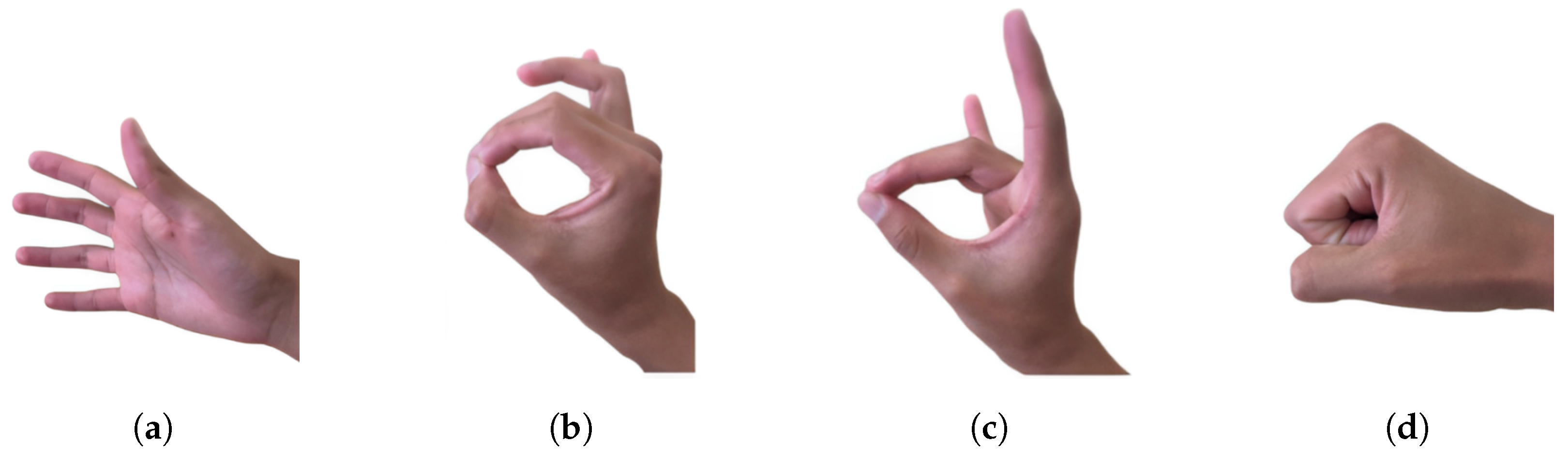 Each participant executed four predefined gestures: open hand, tripod pinch, pointing, and fist. For each gesture, approximately 1250 myoelectric signal samples were recorded using a fixed acquisition window of 50 ms. These data, acquired in a single experimental session per participant under controlled conditions and with short rest intervals between gesture executions, were used exclusively for the analyses presented in