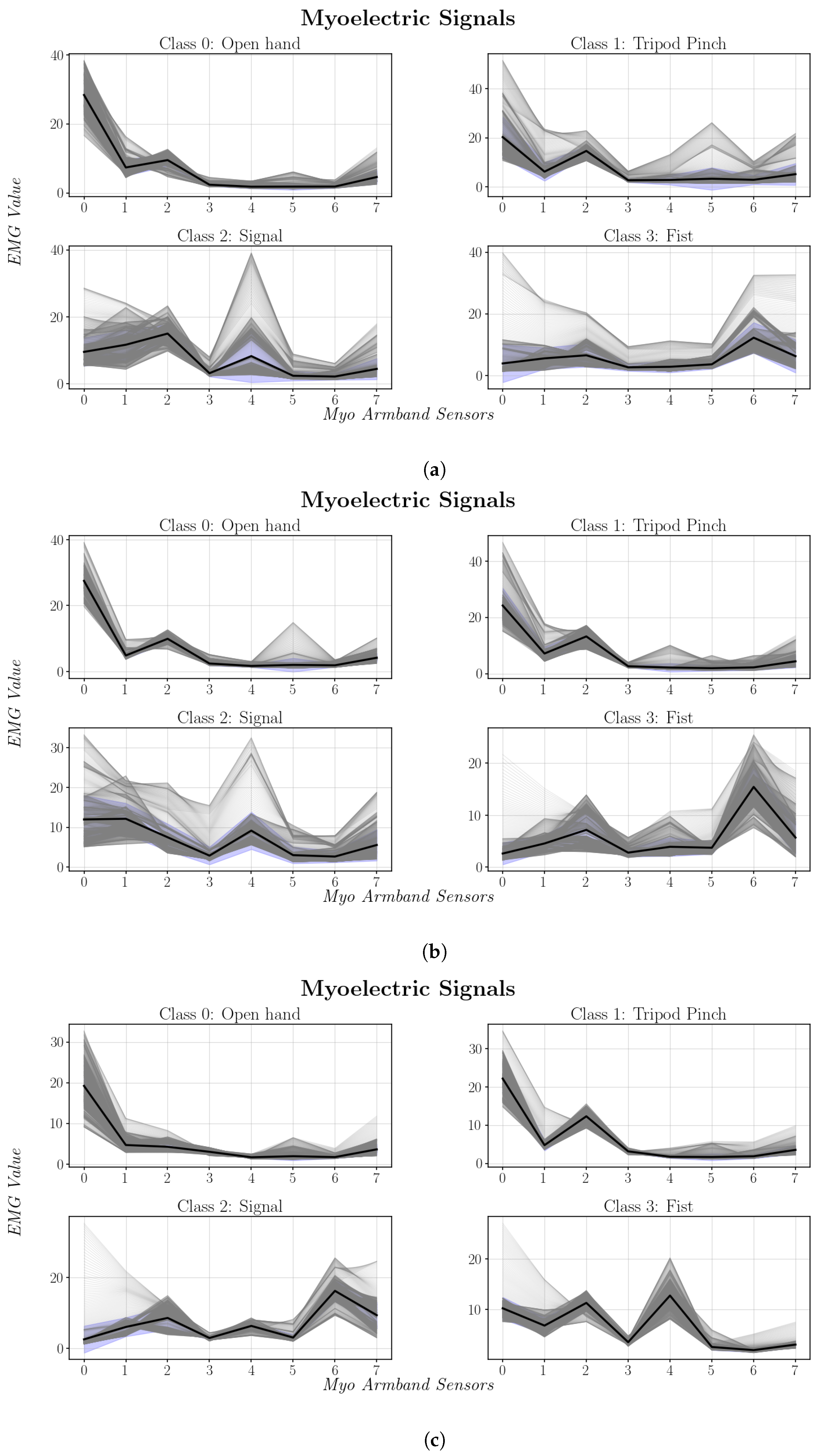 This subsection focuses on the analysis of EMG signal characteristics across multiple users and on the selection of an appropriate analysis window for real-time gesture classification. The experiments were conducted in a single session per participant on the same day, under controlled conditions, and following the acquisition protocol described in the previous subsection.