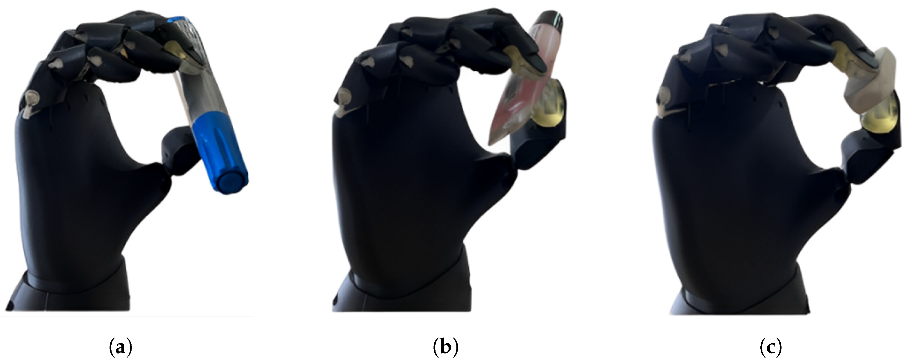 All grasping trials were conducted under consistent initial conditions. At the beginning of each attempt, the prosthesis was initialized in a fully open-hand position. Each trial was triggered by the detection of the EMG signal corresponding to the tripod pinch gesture, ensuring consistent activation across tests.