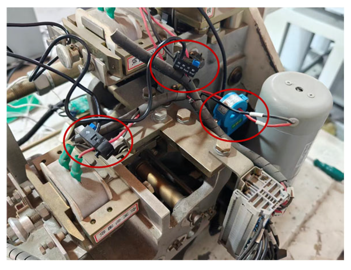 Figure 3, in which a multi-sensor system is installed, including closing pressure sensors, opening pressure sensors, opening/closing current sensors, energy storage motor current sensors, and opening/closing travel sensors. The experimental platform mainly consists of the 220 kV circuit breaker body, a spring operating mechanism box, a multi-source sensor monitoring array, a high-frequency data acquisition unit, and an industrial control computer terminal. This sensor system can monitor the state changes in the operating mechanism during opening and closing actions in real time, providing data support for fault diagnosis.
