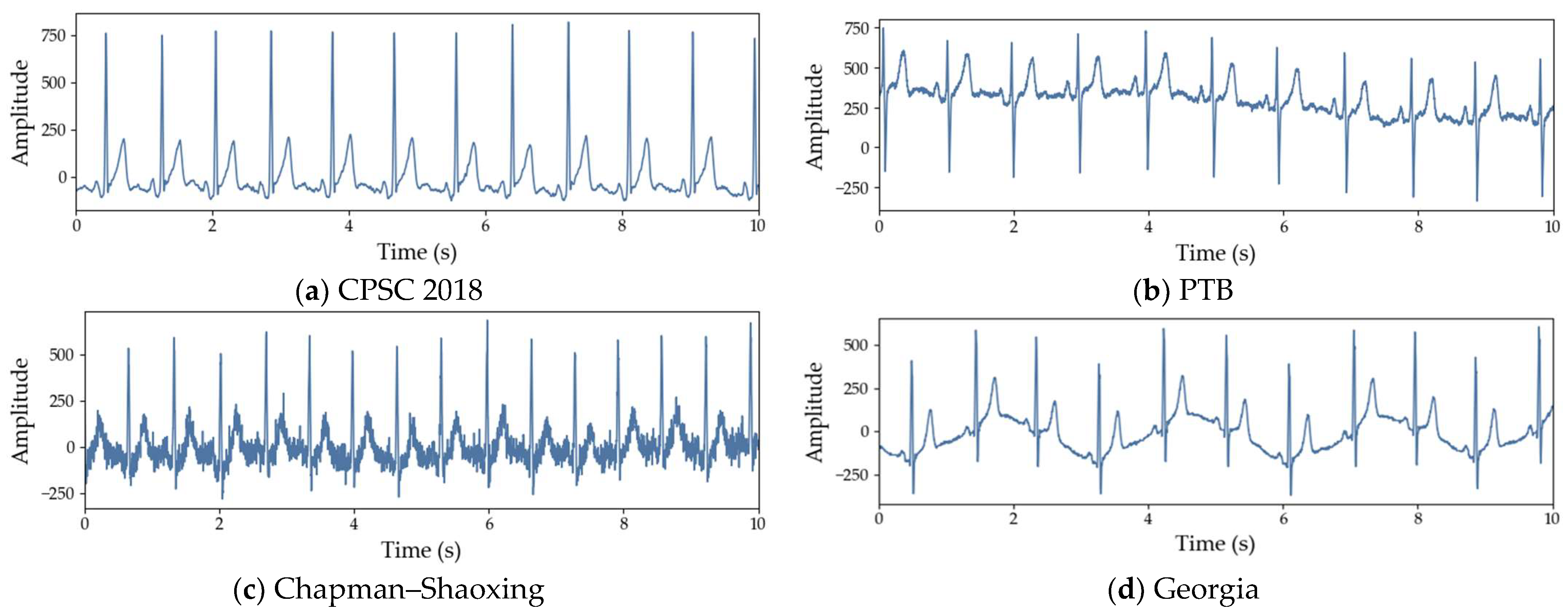 - Liu, F.; Liu, C.; Zhao, L.; Zhang, X.; Wu, X.; Xu, X.; Liu, Y.; Ma, C.; Wei, S.; He, Z.; et al. An open access database for evaluating the algorithms of electrocardiogram rhythm and morphology abnormality detection. J. Med. Imaging Health Inform. 2018, 8, 1368–1373. [Google Scholar] [CrossRef]