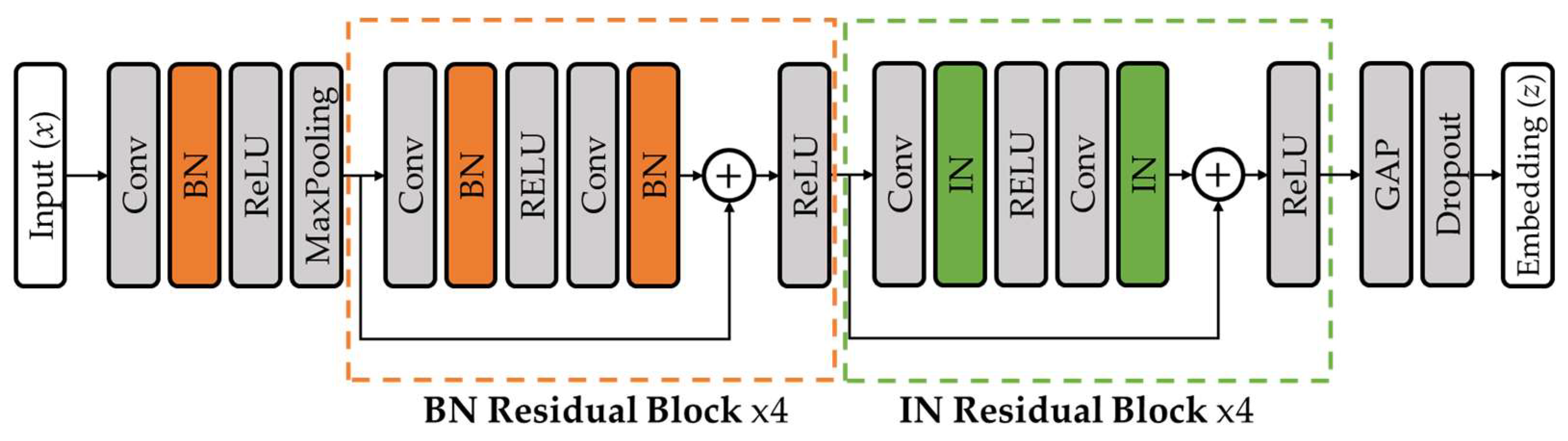 - Pan, X.; Luo, P.; Shi, J.; Tang, X. Two at once: Enhancing learning and generalization capacities via IBN-Net. In Proceedings of the IEEE/CVF Conference on Computer Vision and Pattern Recognition (CVPR); Springer: Cham, Switzerland, 2018; pp. 464–479. [Google Scholar]