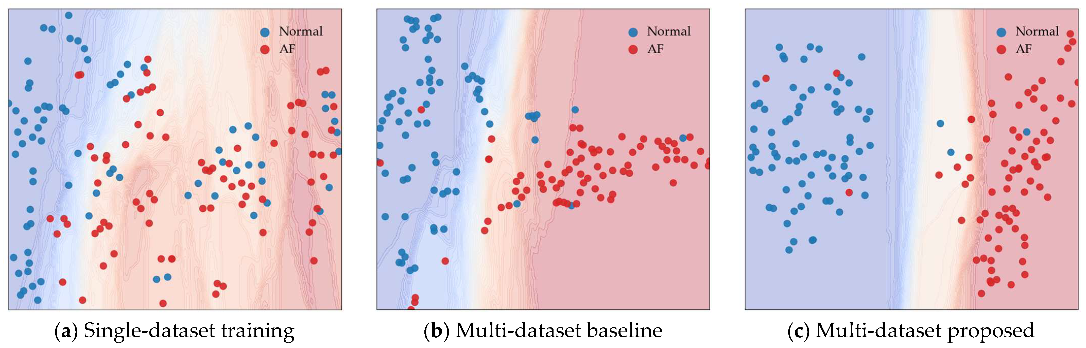 - Deng, F.; Tu, S.; Xu, L. Multi-source unsupervised domain adaptation for ECG classification. In Proceedings of the 2021 IEEE BIBM, Houston, TX, USA, 9–12 December 2021; pp. 854–859. [Google Scholar]