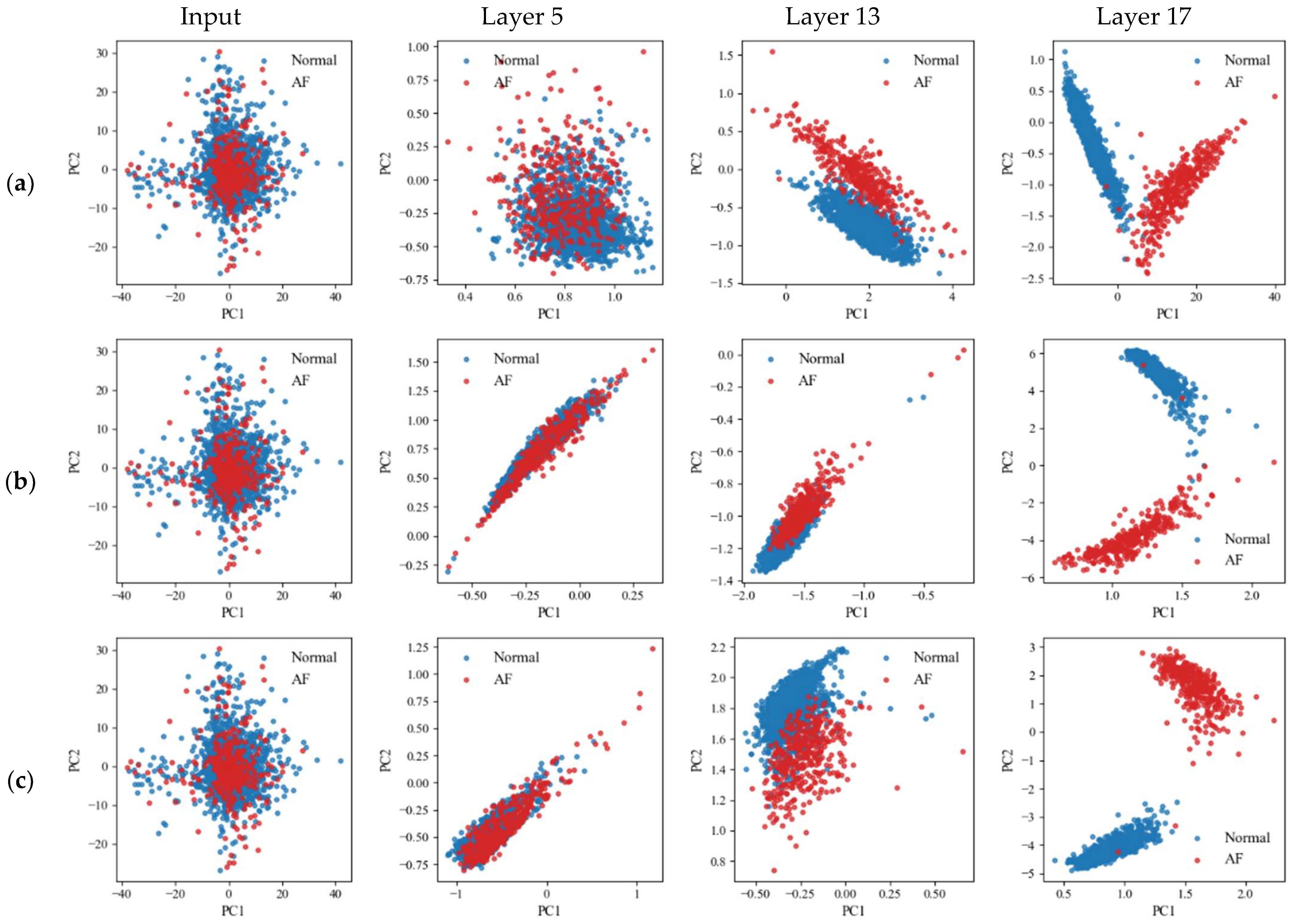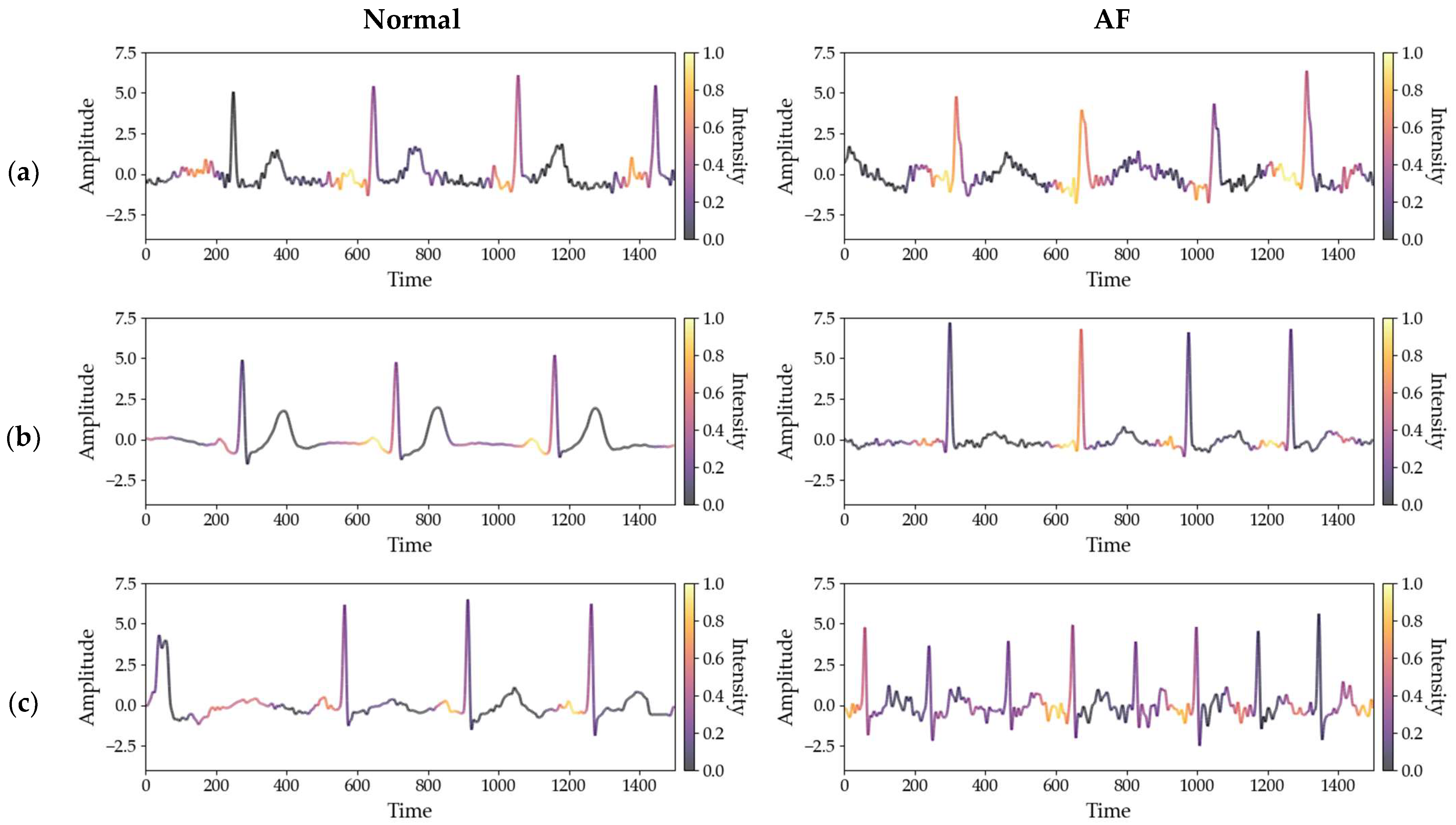 33]. This duration was chosen to provide a sufficient number of heartbeats to reliably analyze beat-to-beat intervals while ensuring a consistent input dimension. Recordings shorter than 10 s were excluded to maintain data integrity. After segmentation, the numbers of normal and AF samples used in the experiments for each dataset are summarized in