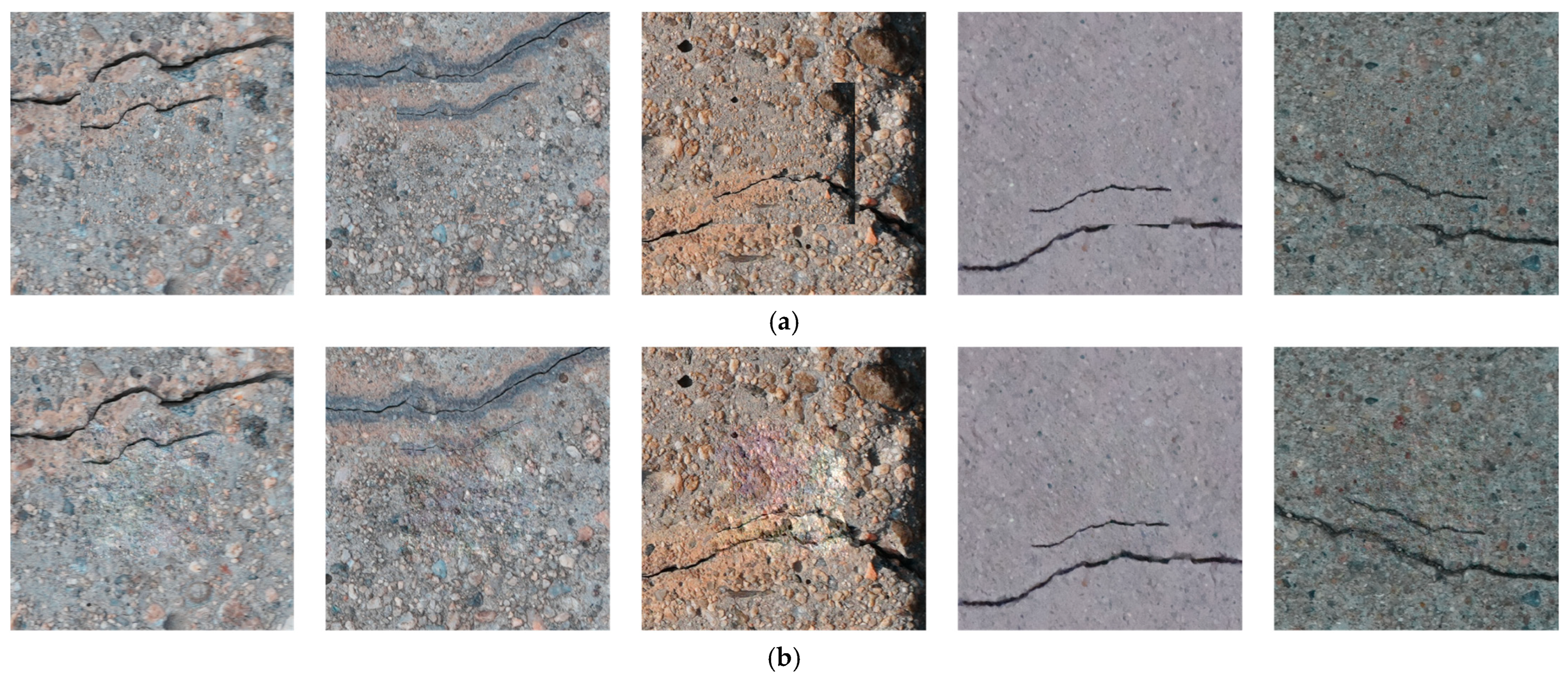 - Guo, M.; Tian, W.; Li, Y.; Sui, D. Detection of Road Crack Images Based on Multistage Feature Fusion and a Texture Awareness Method. Sensors 2024, 24, 3268. [Google Scholar] [CrossRef] [PubMed]