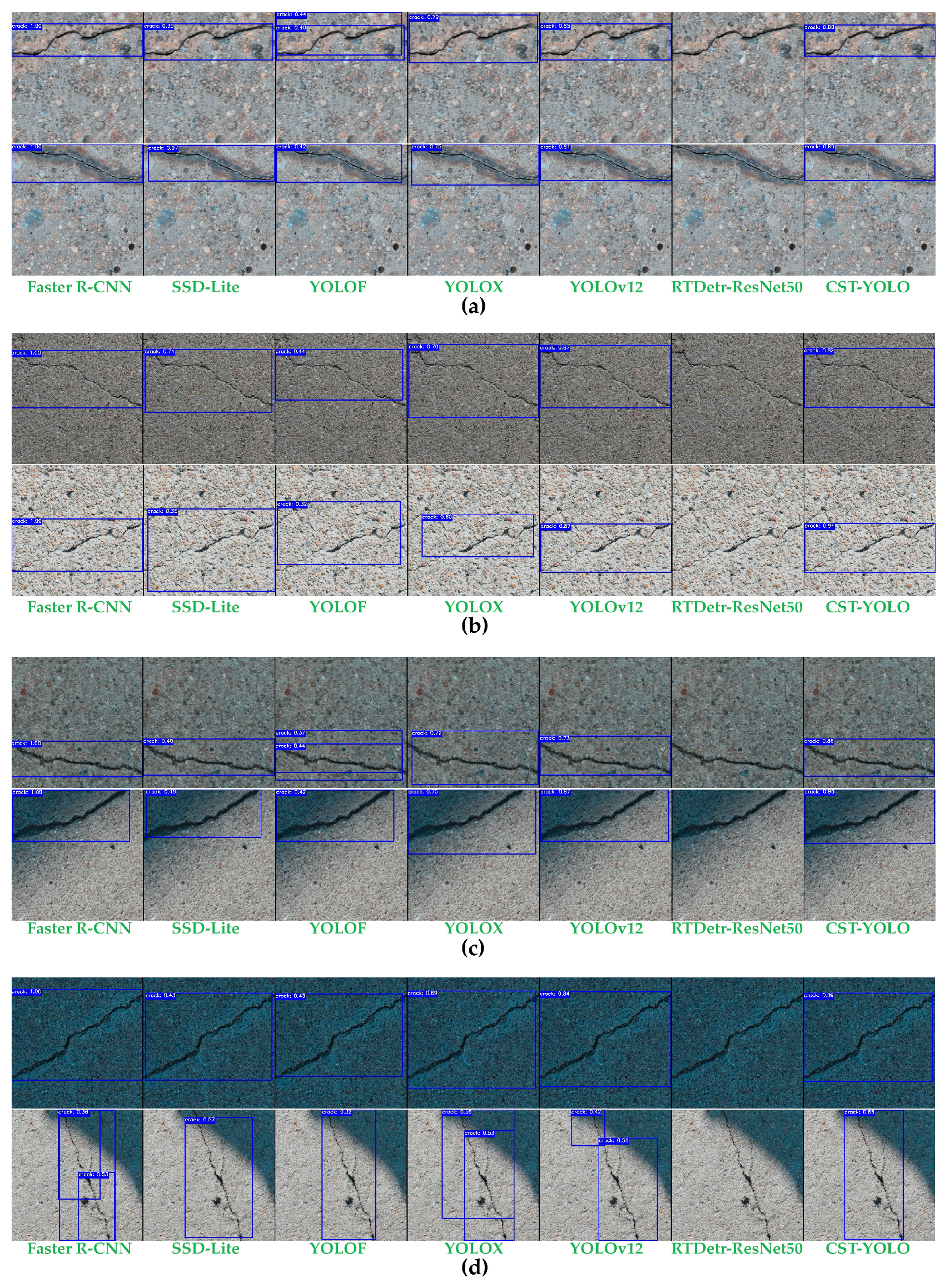 - Li, J.; Jiang, X.; Peng, H. Research on a Road Crack Detection Method Based on YOLO11-MBC. Sensors 2025, 25, 7435. [Google Scholar] [CrossRef]
