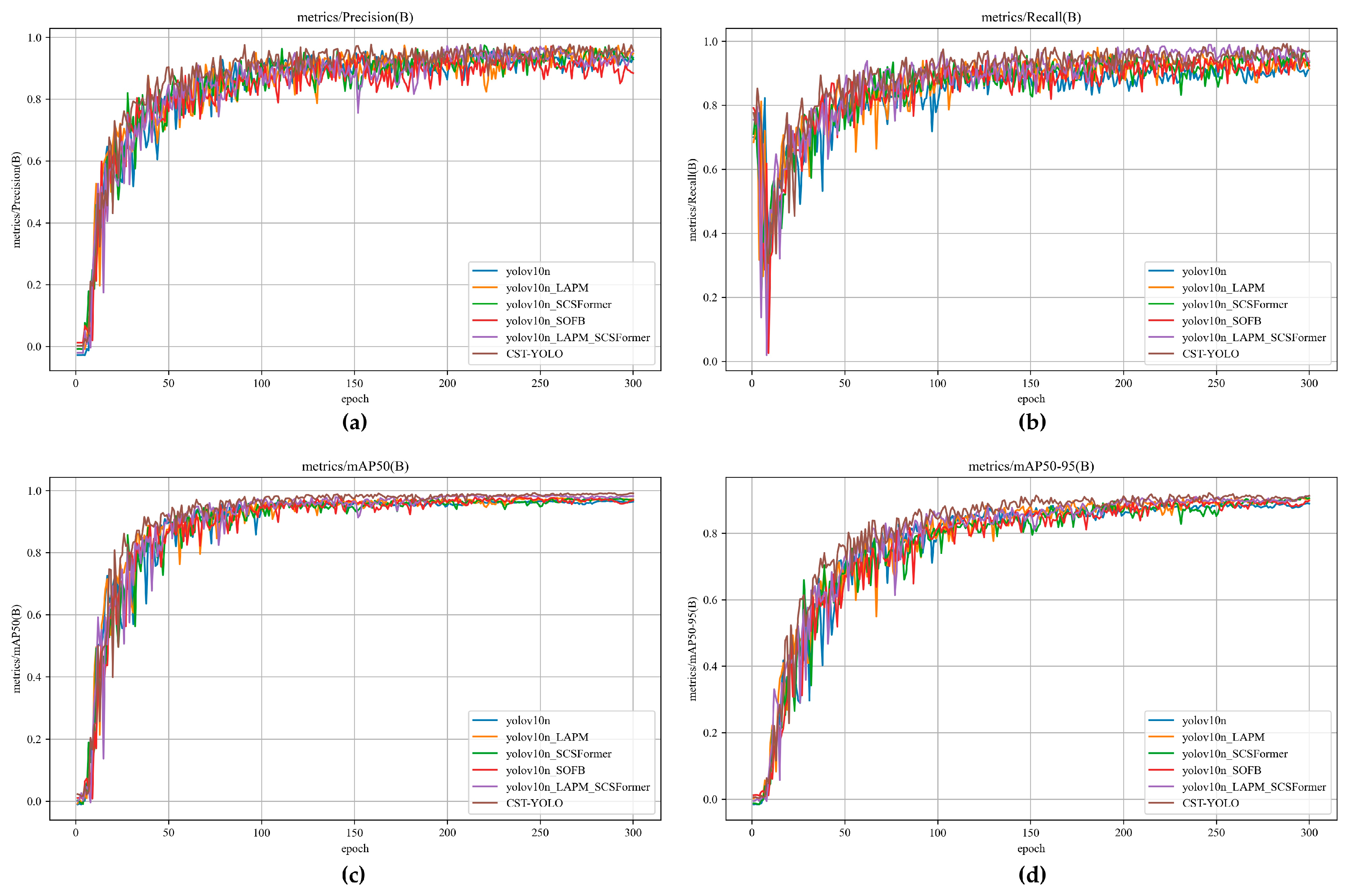 - The YOLOv10 baseline, shown as the blue curve in the following figures;