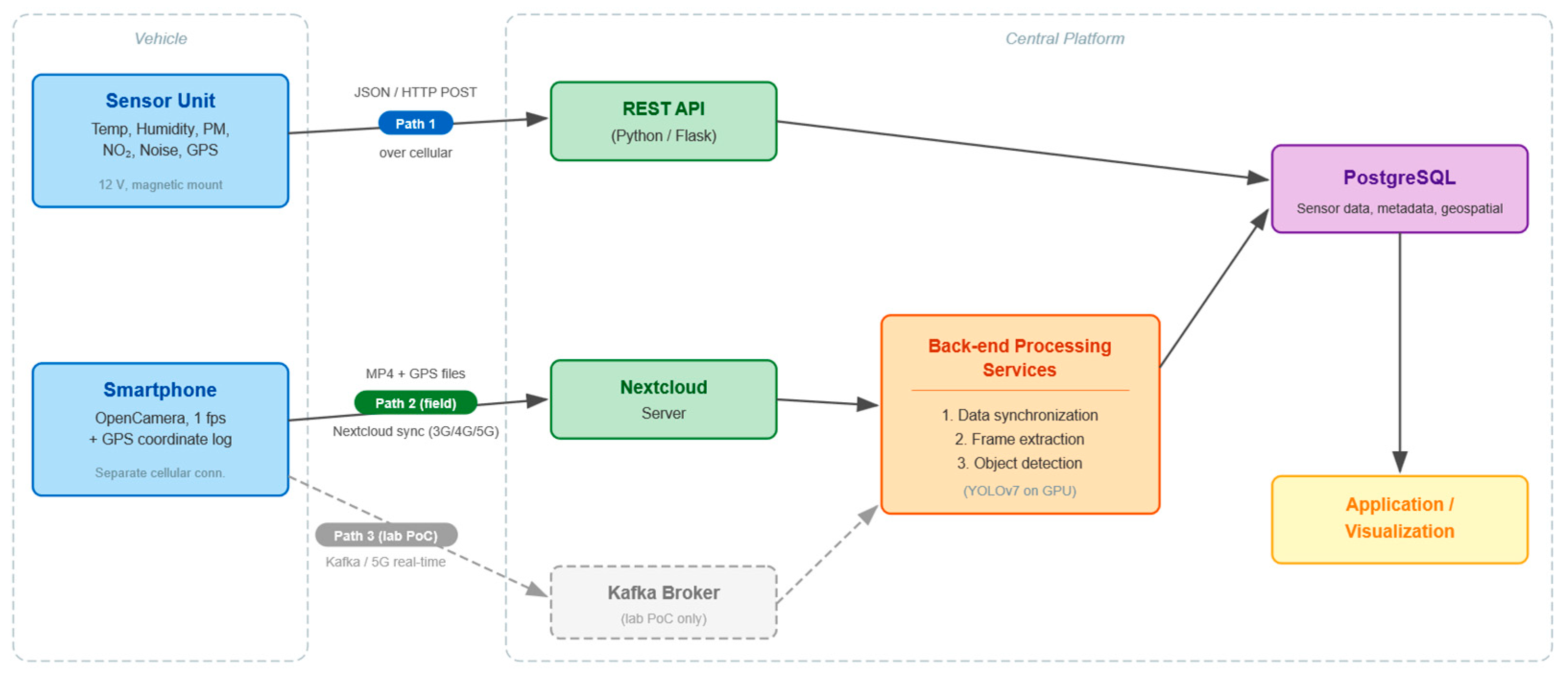 The modular design of the vehicle-mounted sensor unit enables integration of additional measurement capabilities beyond those of the environmental sensors in the current research prototype. One such extension is the characterisation of the urban electromagnetic environment. By incorporating radio-frequency measurement modules or mobile-network diagnostic instruments into the sensor enclosure, participating vehicles can record electromagnetic field strengths and mobile-network performance indicators, such as signal strength, connection type, latency, and throughput, along their operational routes. These measurements, transmitted through the same REST API ingestion pathway and stored alongside other sensor data in the PostgreSQL database, enable the construction of detailed spatial maps of wireless coverage quality and electromagnetic exposure levels. Such data could help telecommunications operators identify coverage gaps, optimise base station placement, and validate network performance under real-world conditions. Public health authorities and urban planners may use electromagnetic exposure maps to assess compliance with exposure guidelines and inform the siting of sensitive facilities such as schools and hospitals. Because the ingestion and storage pipelines treat all structured sensor data uniformly, each measurement is represented as a geotagged, timestamped record associated with a provider, device, and session. Adding new sensor modalities requires no architectural changes; only registering new data fields in the schema and configuring the corresponding visualisation dashboards are required.