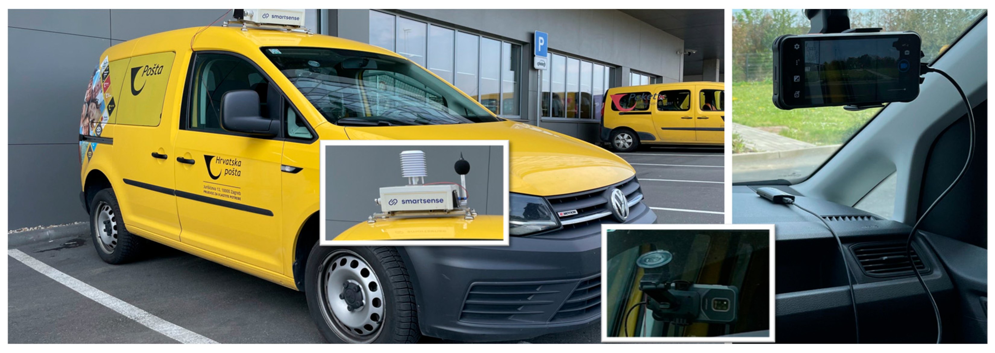 The platform was validated through a phased pilot deployment. During the preparation and experimentation phase, two private vehicles were equipped with sensor units and smartphones to establish baseline system functionality and refine the data acquisition workflow. Subsequently, two vehicles operated by a commercial delivery provider collected data continuously for two months, testing system reliability under realistic operational conditions with independent fleet management.