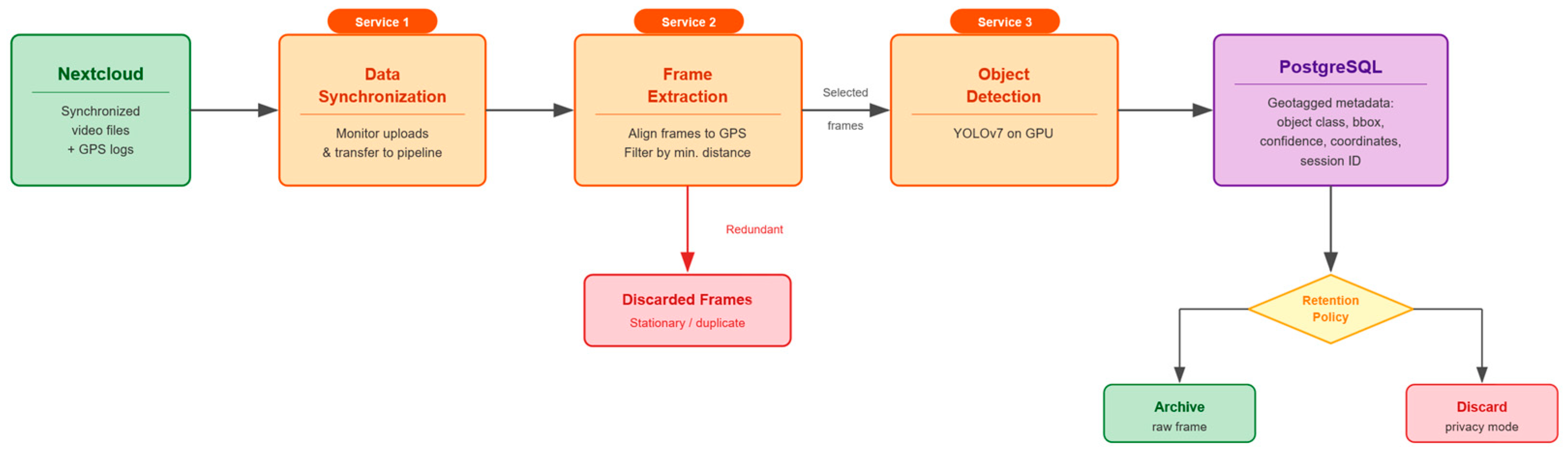 The system architecture was developed in accordance with privacy-by-design principles to mitigate potential risks associated with the processing of visual and environmental data collected in urban settings. A qualitative privacy risk evaluation was conducted, focusing on three main risk categories: identifiable visual data, cross-provider data exposure, and prolonged retention of raw sensor data.