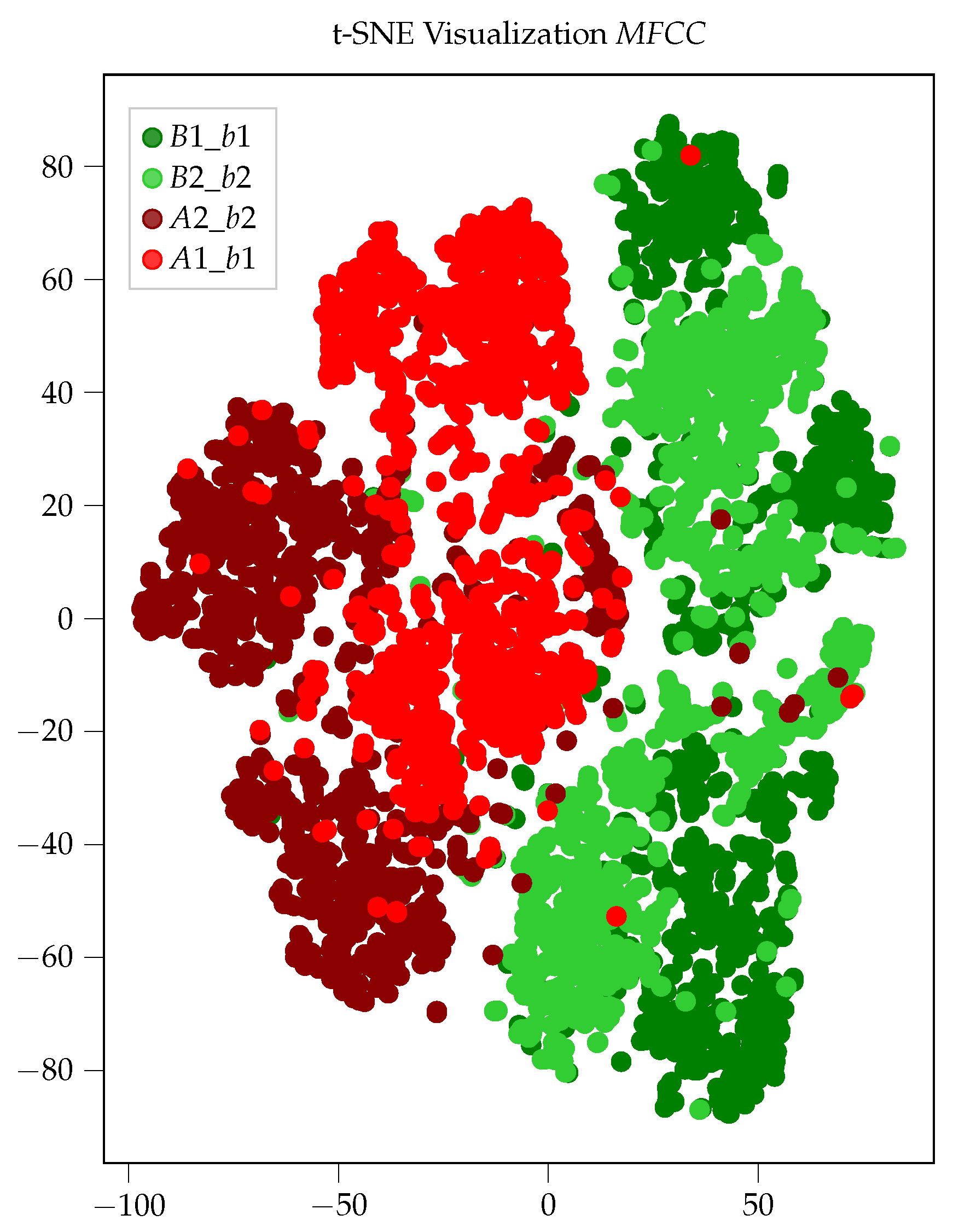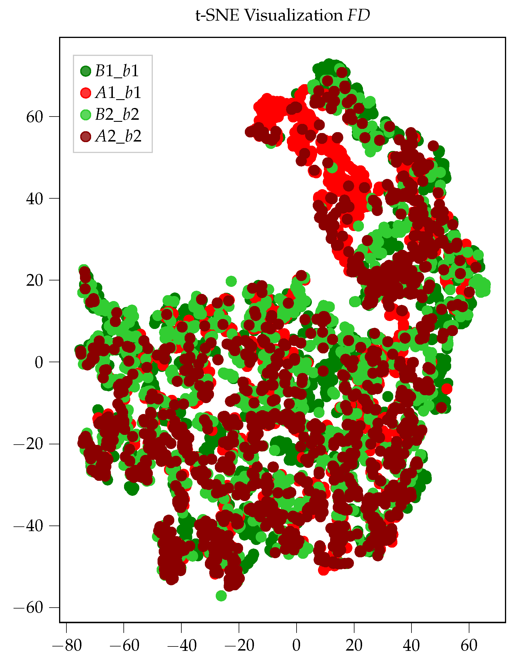 - van der Maaten, L.; Hinton, G.E. Visualizing high-dimensional data using t-SNE. J. Mach. Learn. Res. 2008, 9, 2579–2605. [Google Scholar]