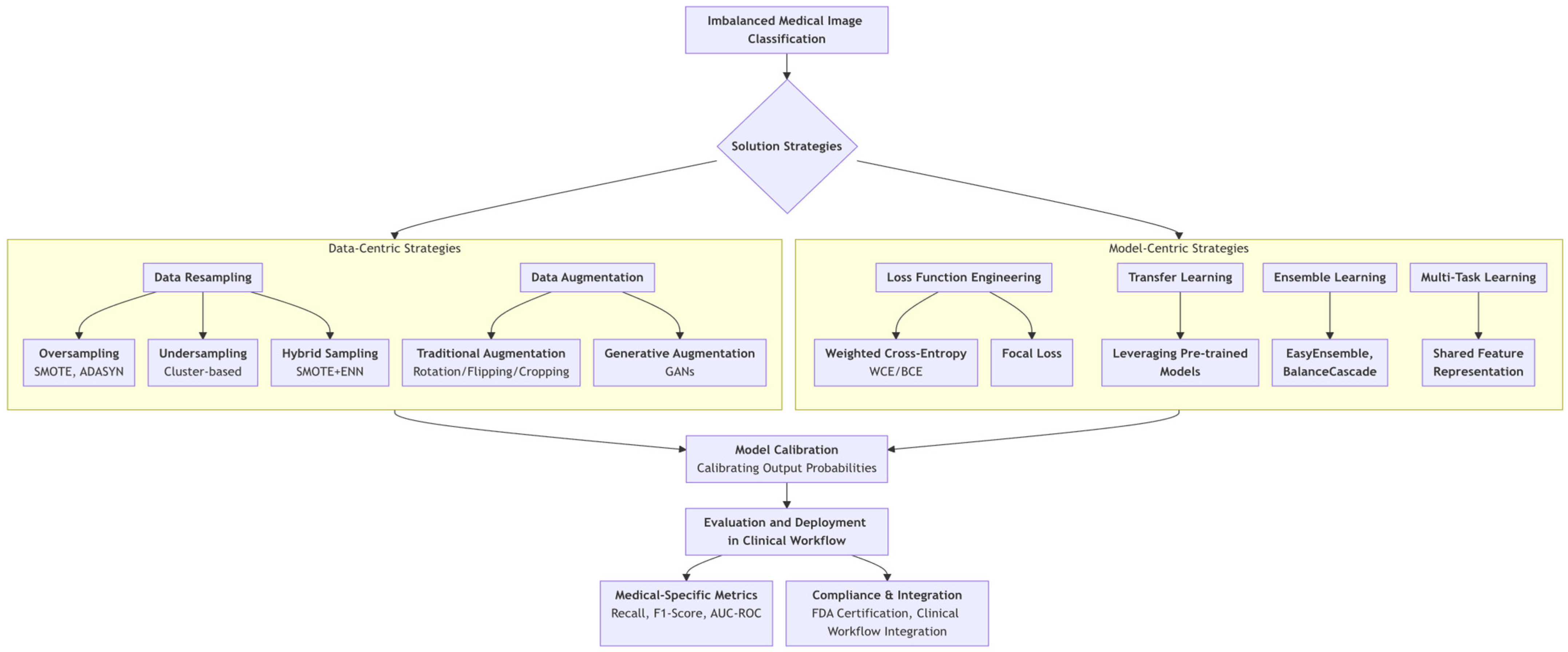 - Foundation Models and Few-Shot Learning Adaptation: The emergence of large-scale, pre-trained foundation models for medical imaging offers a promising alternative to traditional transfer learning. There is often a tension between methods that achieve high accuracy (e.g., complex GANs, deep ensembles) and those that meet clinical needs for speed, interpretability, and regulatory simplicity. By leveraging their rich, general-purpose visual representations, adaptation to new, imbalanced tasks could be achieved through efficient fine-tuning or prompt-based learning with very few examples, potentially bypassing the need for extensive data augmentation or resampling [57].