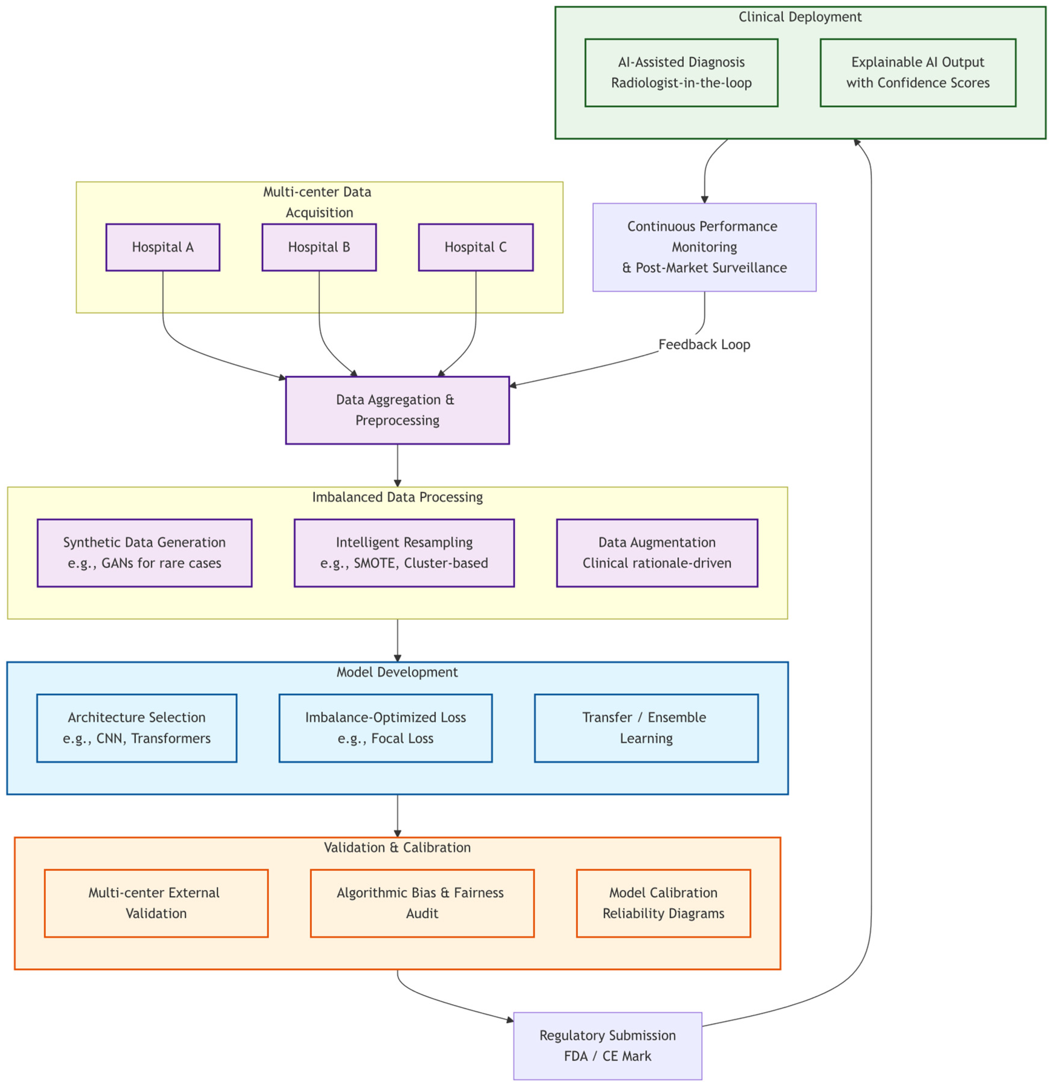 - Multi-Center Data Acquisition and Imbalance-Aware Processing: The pipeline begins with aggregating imaging data from diverse sources (Hospitals A, B, C). This inherently imbalanced dataset then undergoes specialized preprocessing, including synthetic data generation (e.g., GANs for rare cases), intelligent resampling (e.g., SMOTE), and clinically rational data augmentation to create a more balanced and robust training set.