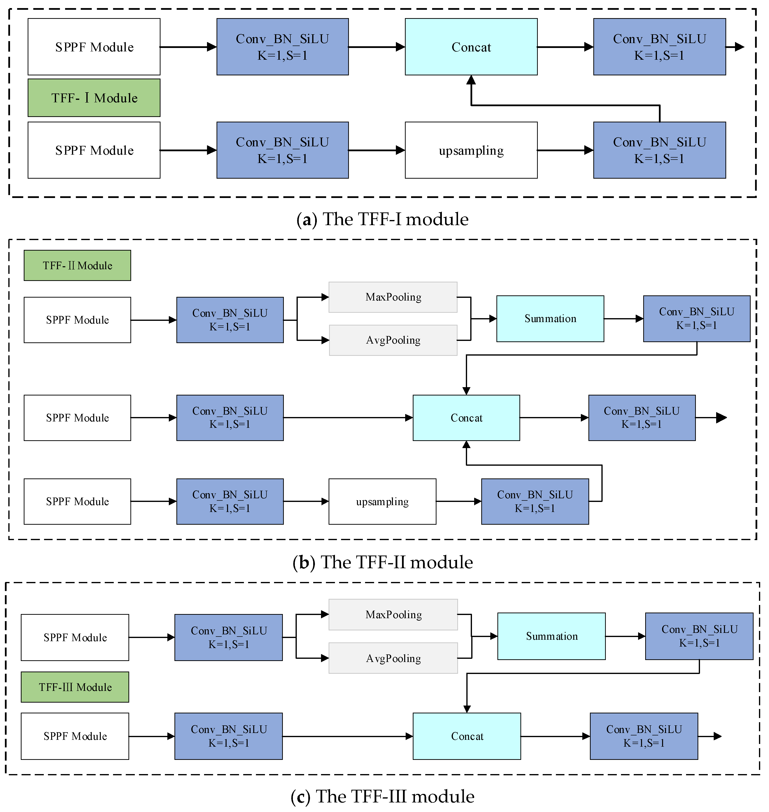 TFF Module: T-YOLO incorporates the TFF module in the neck network. The computational complexity increases to 33.092 G, and the detection speed drops to 115 FPS. However, the AP for Cr improves to 41.51%, and the mAP reaches 74.07%, demonstrating the value of multi-scale feature fusion.