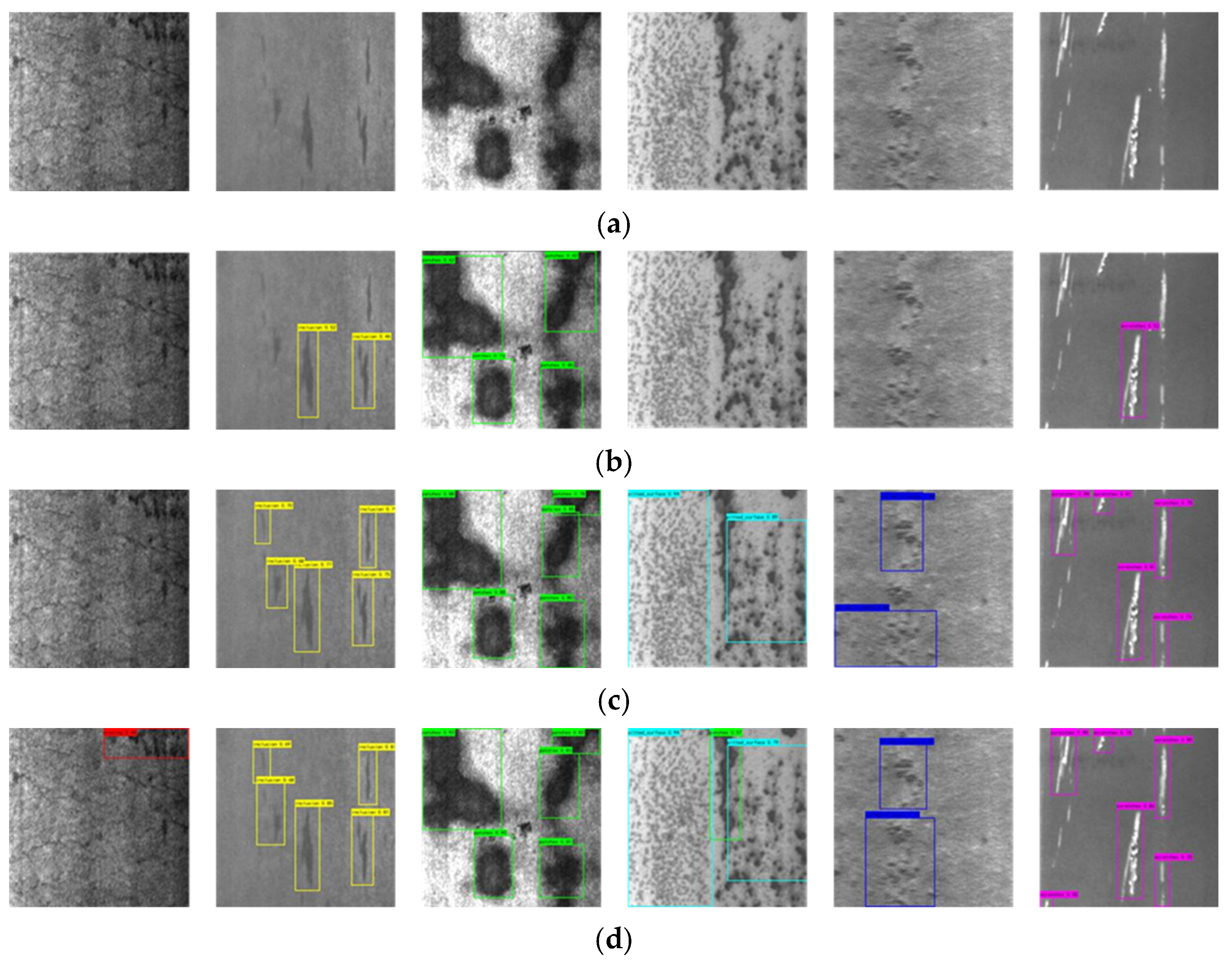 Figure 9a–d) show that the proposed algorithm improves detection accuracy compared to other models, effectively detecting various steel surface defects with lower computational costs and high real-time performance.