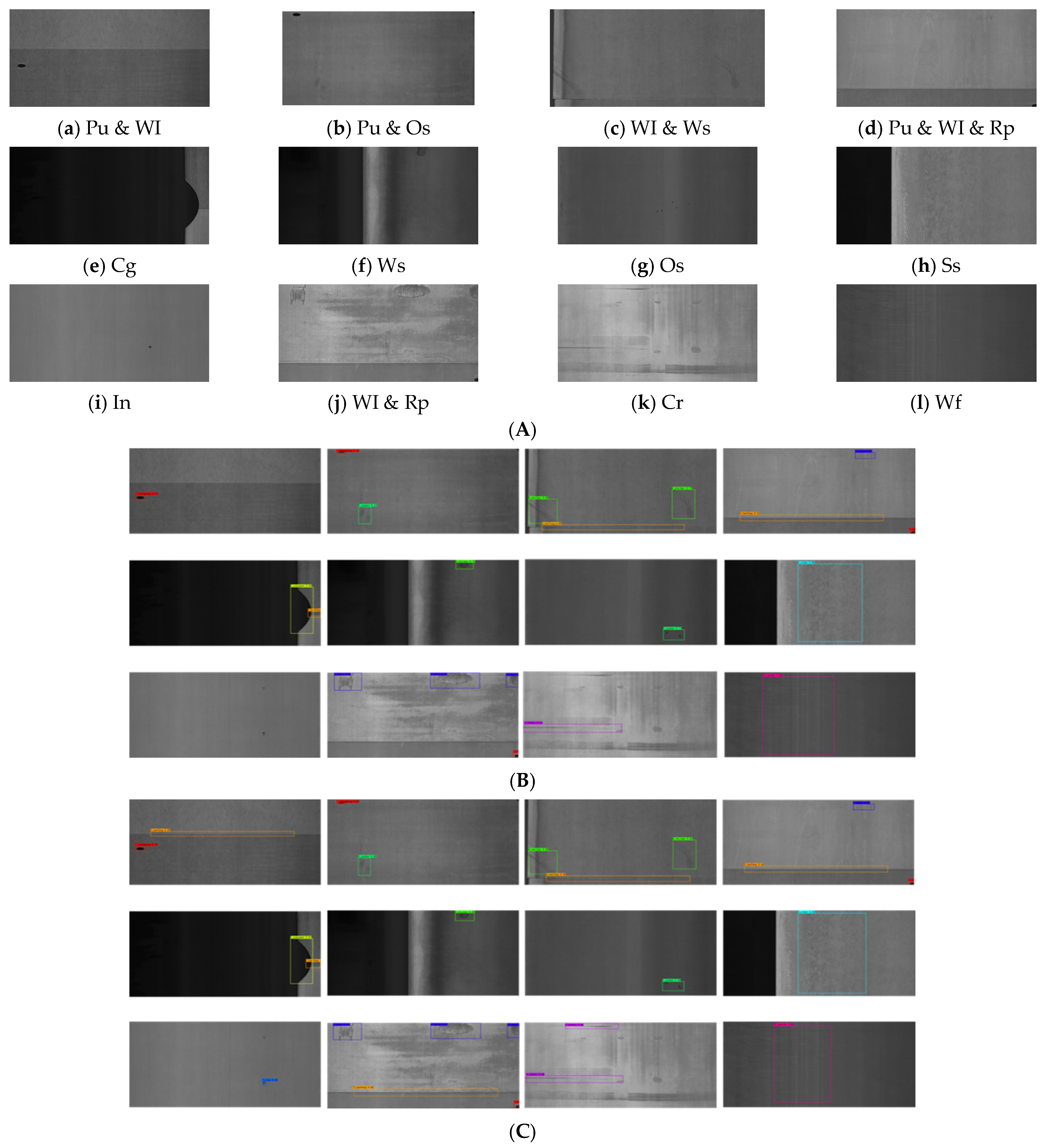 Figure 10(Aa–Al). For comparison, the detection algorithms used on the GC10-DET dataset were mainly selected. However, considering that some models do not have verification results on the GC10-DET dataset, some improved algorithms with excellent performance are also introduced for comparison. In the experiment, AP and mAP were used as evaluation indicators.
