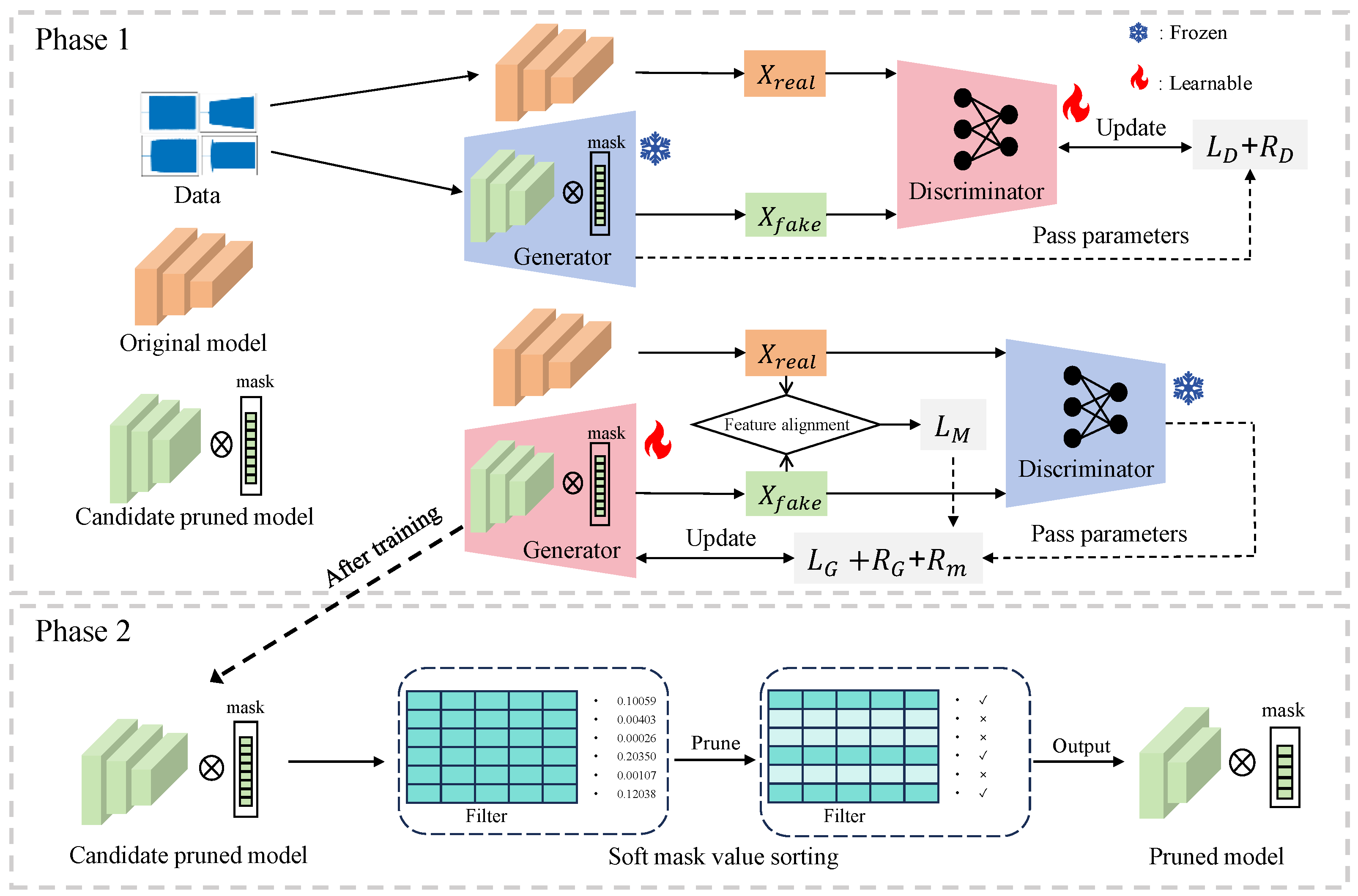 In this work, adversarial learning is adopted as a mechanism for global output distribution alignment during pruning. Since channel removal may weaken the representation capacity of the compressed network, the resulting output distribution can deviate from that of the baseline model. This issue is particularly important for RFFI, where reliable identification depends on sufficiently rich and discriminative feature representations. By encouraging the pruned network to match the global output distribution of the baseline model, adversarial learning helps compensate for the loss of useful features caused by pruning and supports performance recovery. Specifically, the generator corresponds to the pruning network , while the discriminator corresponds to . Different from conventional GANs that generate samples from random noise, the “fake” samples in our framework are the outputs of the pruning network, whereas the “real” samples are the outputs of the fixed pre-trained baseline network .