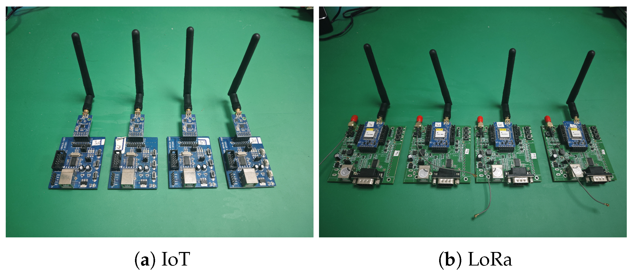 We employed the F8L10A LoRa wireless communication module (Xiamen Four-Faith Communication Technology Company Limited, Xiamen, China) and the E05-MLE124AP2 IoT module (Chengdu Ebyte Electronic Technology Company Limited, Chengdu, China), which are widely used in IoT communication scenarios, as the transmitting devices. The E05-MLE124AP2 is a plug-in 2.4 GHz wireless module. The two wireless transmitters are shown in