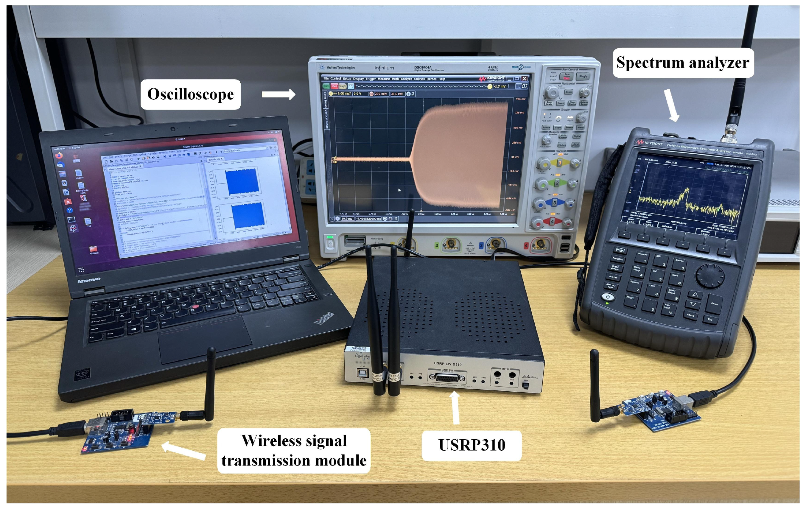 A Universal Software Radio Peripheral X310 (USRP X310, Wuhan Luoguang Electronics Company Limited, Wuhan, China), operated under the USRP Hardware Driver version 3.14.1, was used for signal acquisition to ensure flexibility and scalability. A wireless RF signal acquisition system was implemented on the GNU Radio platform (version 3.7.13.5), and the experimental setup is shown in