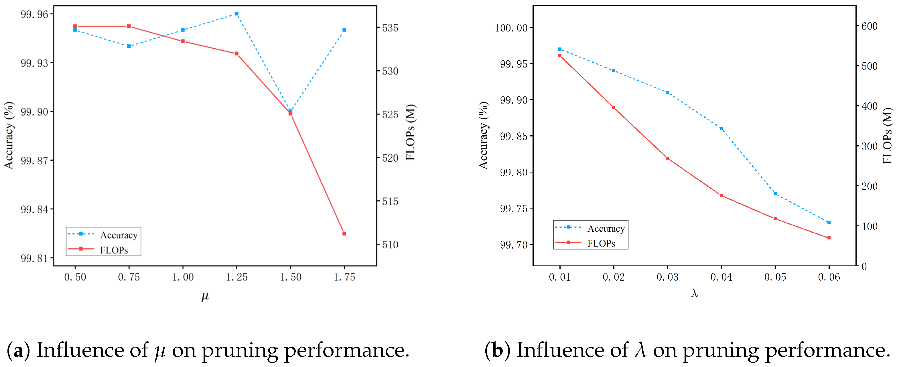 This section analyzes the impact of hyperparameters in the proposed adversarial learning-based polarization pruning algorithm, focusing on the effects of the polarization parameter and the sparsity factor on the identification accuracy and computational complexity (FLOPs) of the pruned model. The experiments were conducted on the IoT dataset using VGG16 as the pruning backbone. The results are consistent with the role of and in controlling channel sparsity and feature preservation.