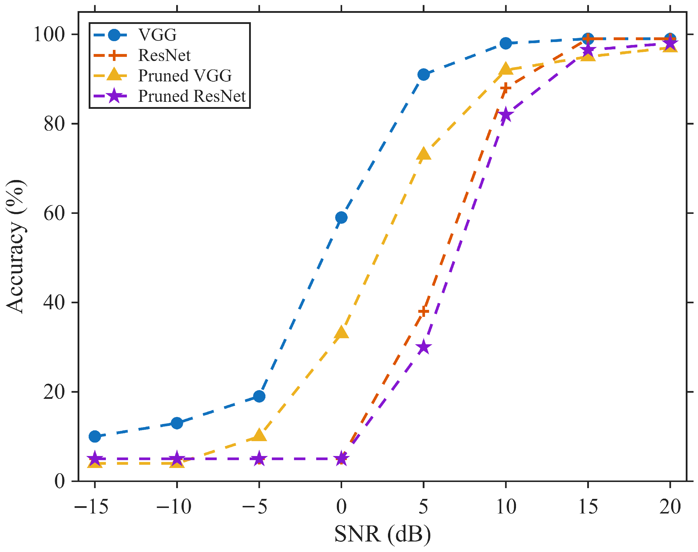 As shown in the figure, compared with ResNet18, the pruned VGG16 exhibits a larger degradation in identification accuracy under noisy environments. This is mainly because the channel pruning ratio of VGG16 on the IoT dataset is higher than that of ResNet18, which more noticeably affects the network’s ability to extract high-level RF fingerprint features. By comparing the VGG16 network before and after pruning, it can be observed that when the SNR is relatively high (SNR > 10 dB), pruning has a limited impact on noise robustness. As the SNR decreases, the accuracy degradation of the pruned network becomes more pronounced, indicating that some of the pruned channels contribute to capturing subtle signal features affected by noise, an effect that is more evident at lower SNR levels.