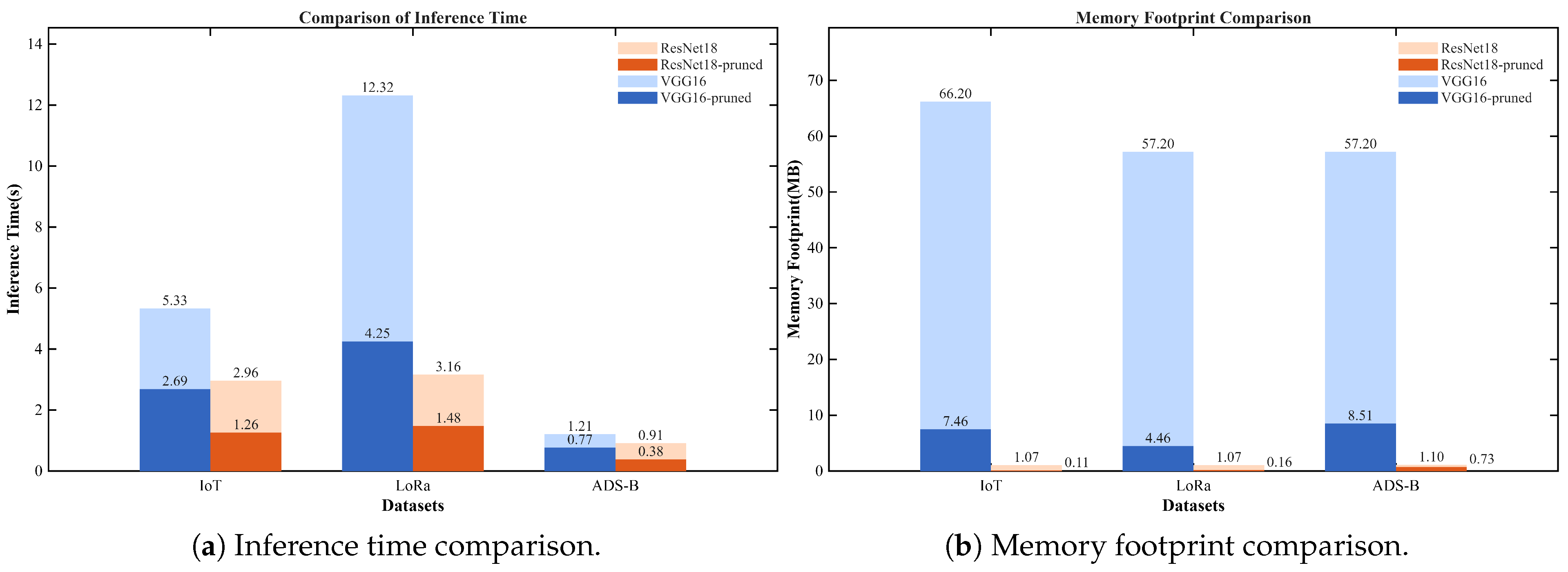 Furthermore, this section investigates the practical inference performance and memory consumption of the models before and after pruning on the Jetson TX2 platform. The inference time and model parameter memory footprint of VGG16 and ResNet18 were evaluated on the LoRa, ADS-B, and IoT datasets. The experimental setup is shown in