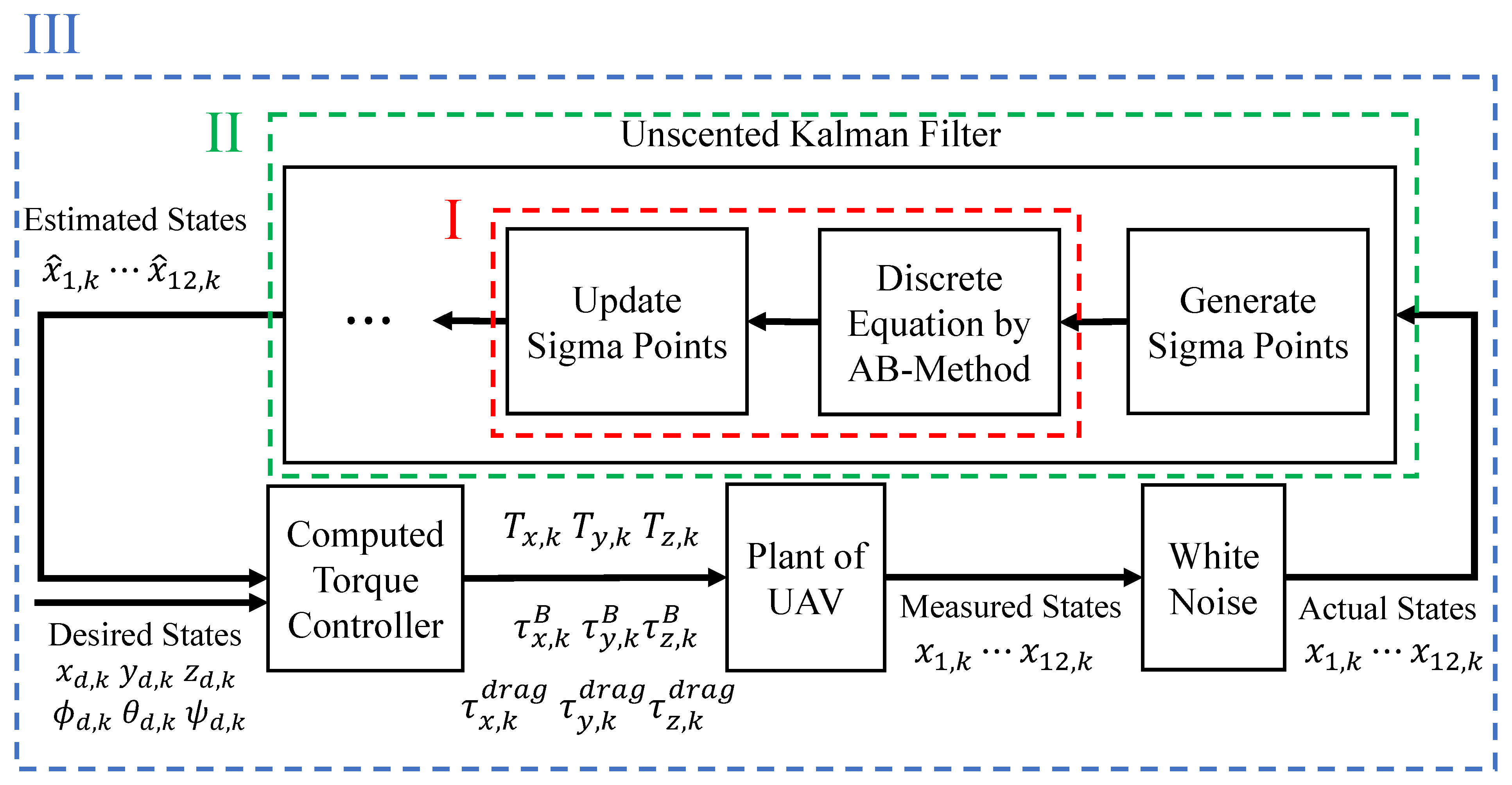 - For the complex 12-dimensional UAV model (Table 6), the computation time of AB4-based UKF was approximately 5.1% shorter than Euler-based UKF (faster than Euler). In contrast, RK4-based UKF exhibited a more pronounced slowdown, with an approximately 20.0% increase.