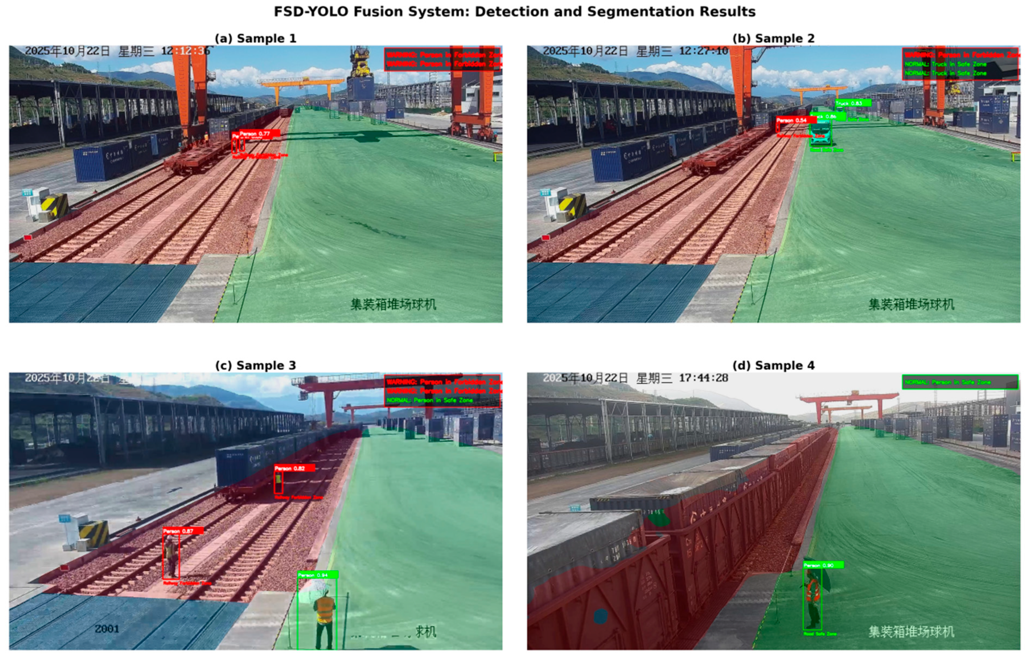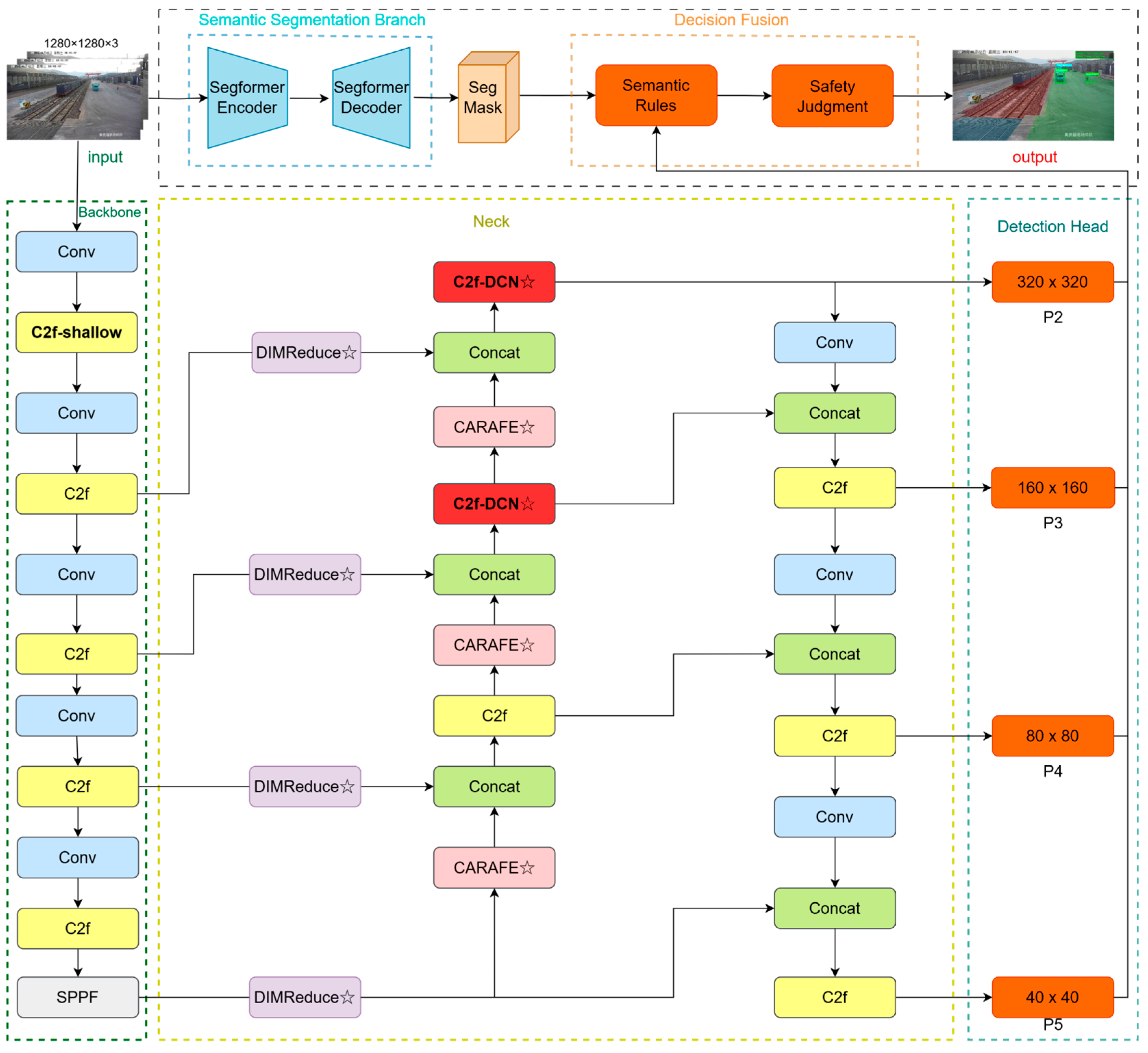 - A dual-branch architecture that integrates semantic segmentation and object detection is designed. A SegFormer-based module is employed for pixel-level region segmentation, and decision-level fusion is applied to enable region-aware intelligent safety warning, effectively addressing the lack of regional semantic information.