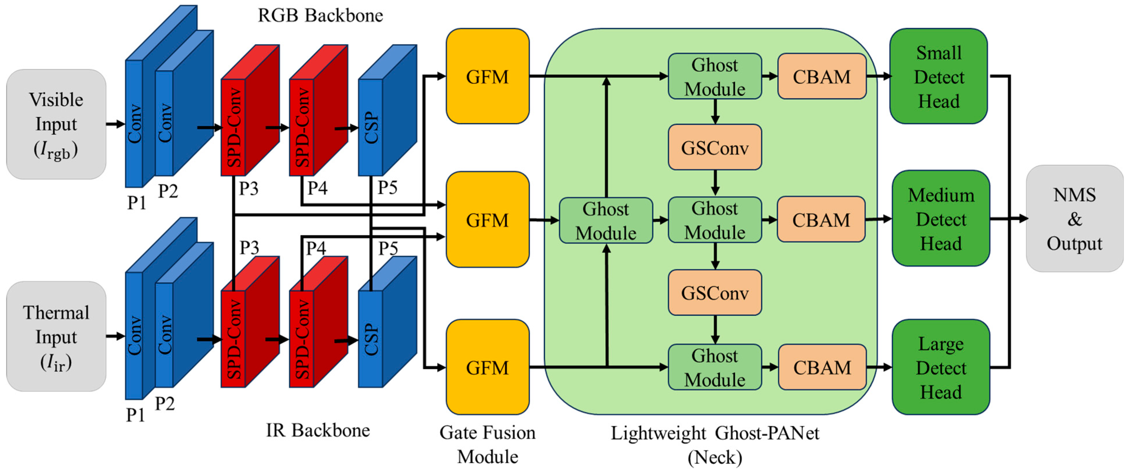 - Lightweight Semantic Aggregation: The fused features are aggregated using a Path Aggregation Network (PANet). To offset the computational overhead of the dual-stream backbone, the neck is reconstructed using Ghost Modules [13] and GSConv [14]. Furthermore, CBAM [36] attention blocks are embedded to refine the fused features before they are fed into the three decoupled detection heads.