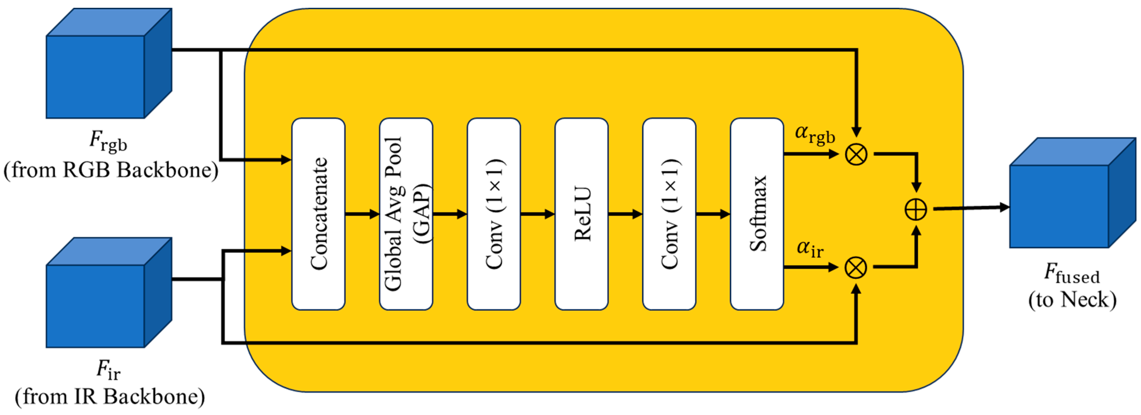 - Adaptive Multimodal Gated Fusion Mechanism (GFM): We design a lightweight global-context gating mechanism between the dual backbones to adaptively regulate the contributions of RGB and thermal features under different scene conditions. Instead of static fusion, GFM estimates complementary modality weights from globally pooled RGB–IR features through a compact Multi-Layer Perceptron (MLP) followed by Softmax normalization, enabling scene-adaptive modality calibration with negligible computational overhead.