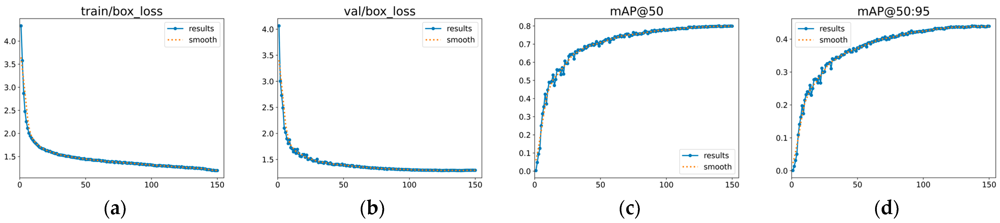 - mAP@50:95 (%): The average mAP calculated at different IoU thresholds ranging from 0.5 to 0.95 with a step size of 0.05. This is a much stricter metric that heavily penalizes imprecise bounding boxes, thereby effectively reflecting the model’s high-precision localization capability for small targets.