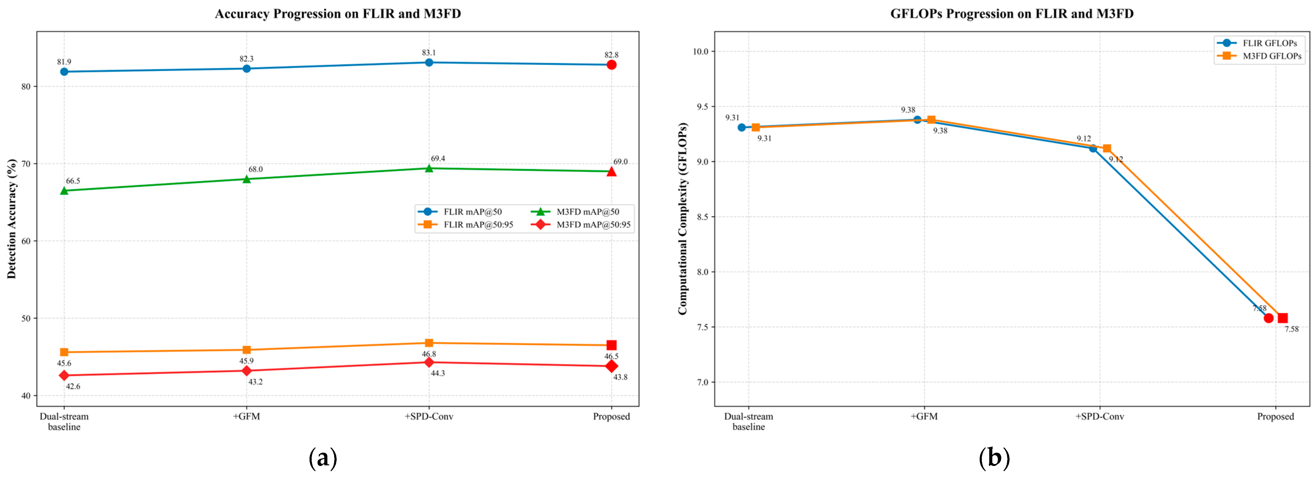| Method | GFM | SPD-Conv | Ghost-Neck | Params(M) | GFLOPs (G) | FLIR | M3FD | ||