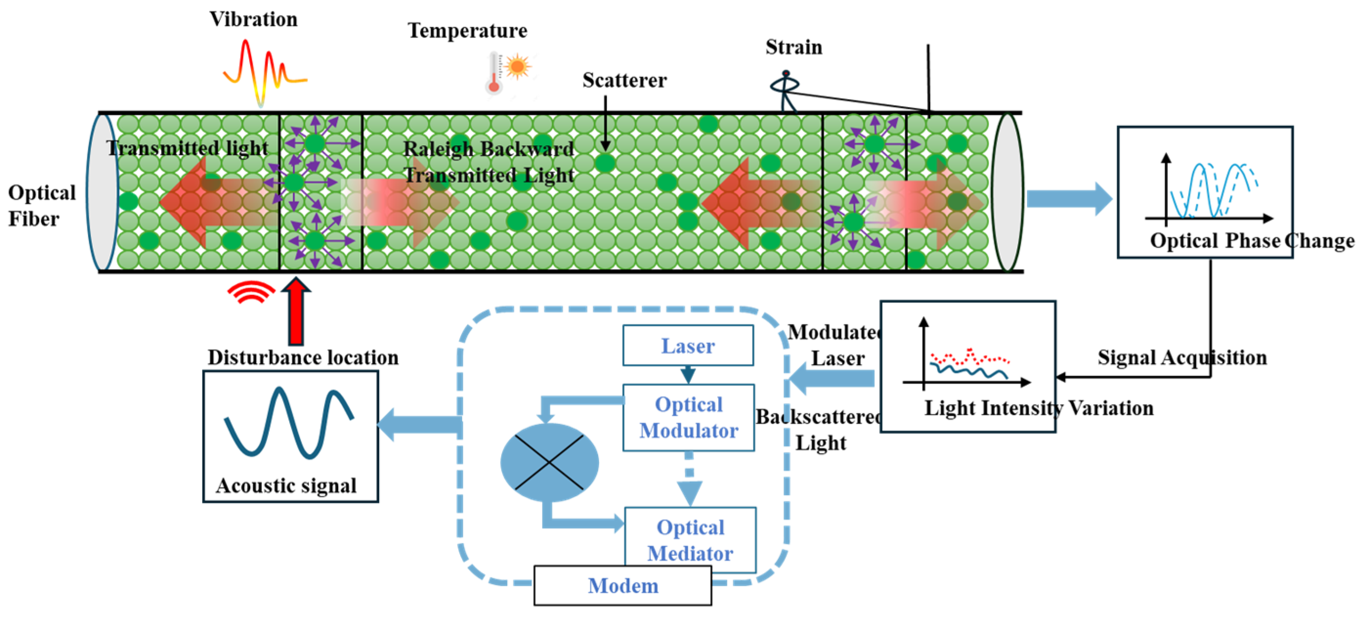 26]. When light waves propagate in the fiber core, they interact with environmental factors around the optical fiber, such as vibration and strain. These interactions induce slight changes in the intensity, frequency, and phase of the optical signal. A typical DAS system mainly consists of two core parts: a demodulator (modem) and a sensing optical fiber. The laser inside the demodulator emits light, which is modulated by the optical modulator and injected into the sensing fiber. During propagation in the fiber core, the light generates Rayleigh backscattered light, which carries the optical change information induced by external vibration and returns to the demodulator along the original path. Through demodulation and analysis of the Rayleigh backscattered signal, the tiny changes in light phase and intensity can be converted into the corresponding vibration signal, thus realizing real-time monitoring of vibration along the optical fiber [