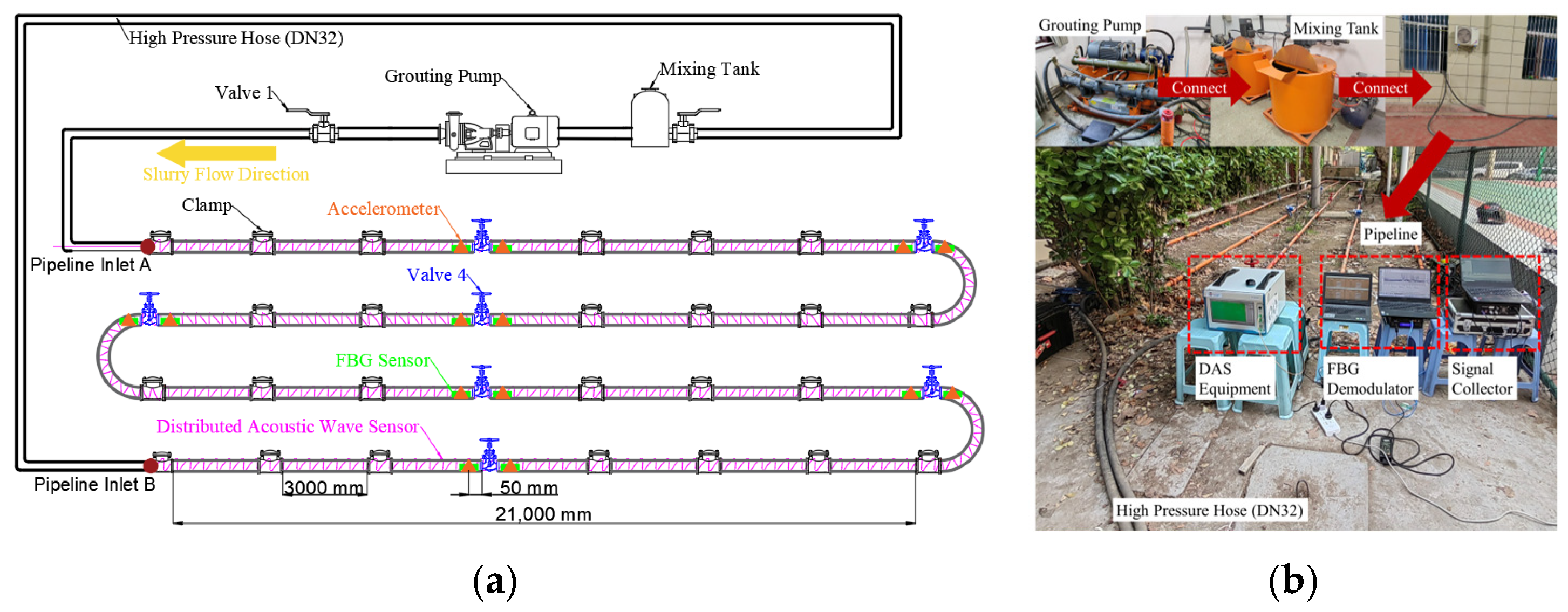 To address these gaps, this study develops a DAS-based multi-sensor fusion framework for quantitative blockage assessment in coal gangue slurry pipelines—a capability rarely to be realized in existing DAS monitoring approaches. A slurry pipeline circulation test platform with gradient blockage simulation (0% to 76.42%) and a synchronous multi-sensor monitoring system were first established. The three core contributions of this study are summarized below: