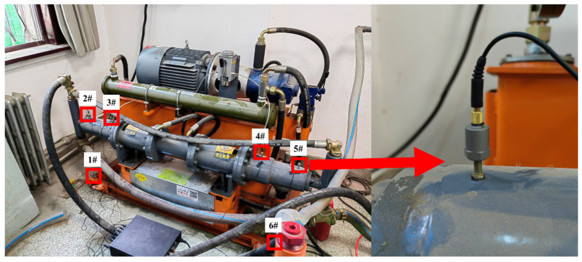 2), frequency range 0.5 Hz–5 kHz) were installed 50 mm upstream and downstream of each valve on the pipe outer wall, matched with a YMC9800 dynamic data acquisition unit (Yangzhou YMC Measurement Technology Co., Ltd., Yangzhou, China) for synchronous signal collection. Schematic diagrams and photographs of the test platform and monitoring system are shown in