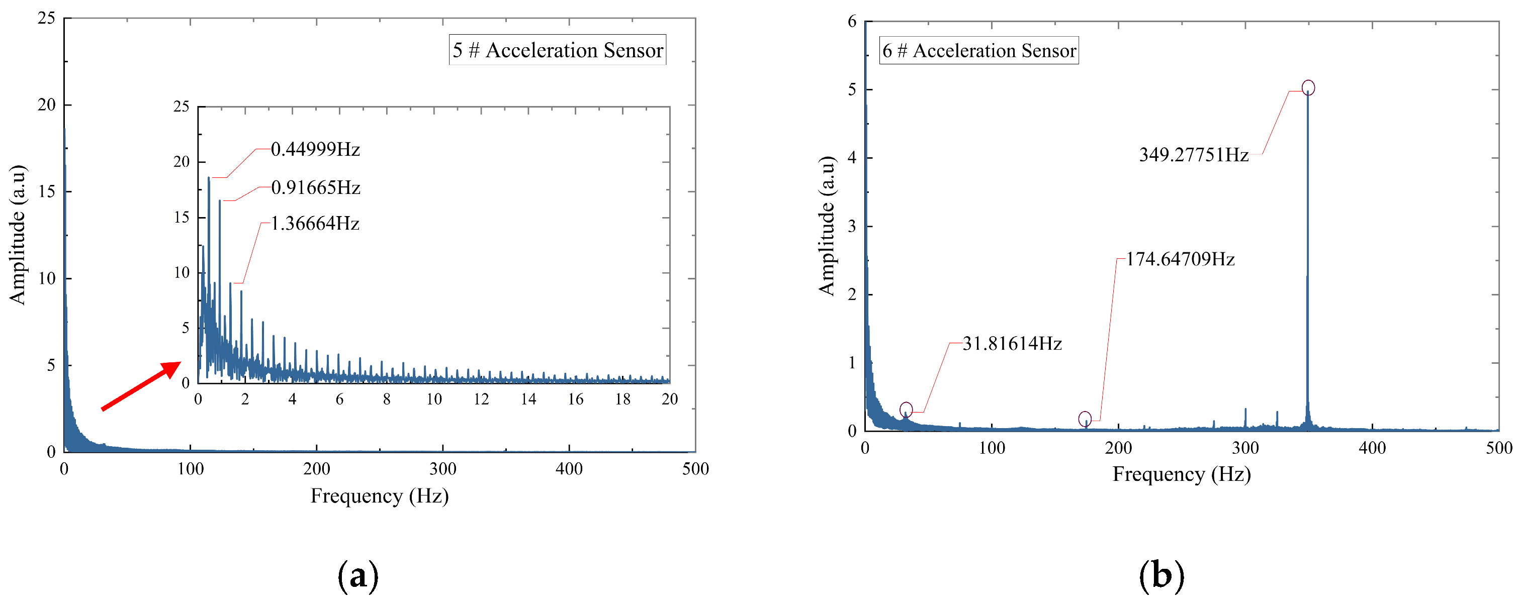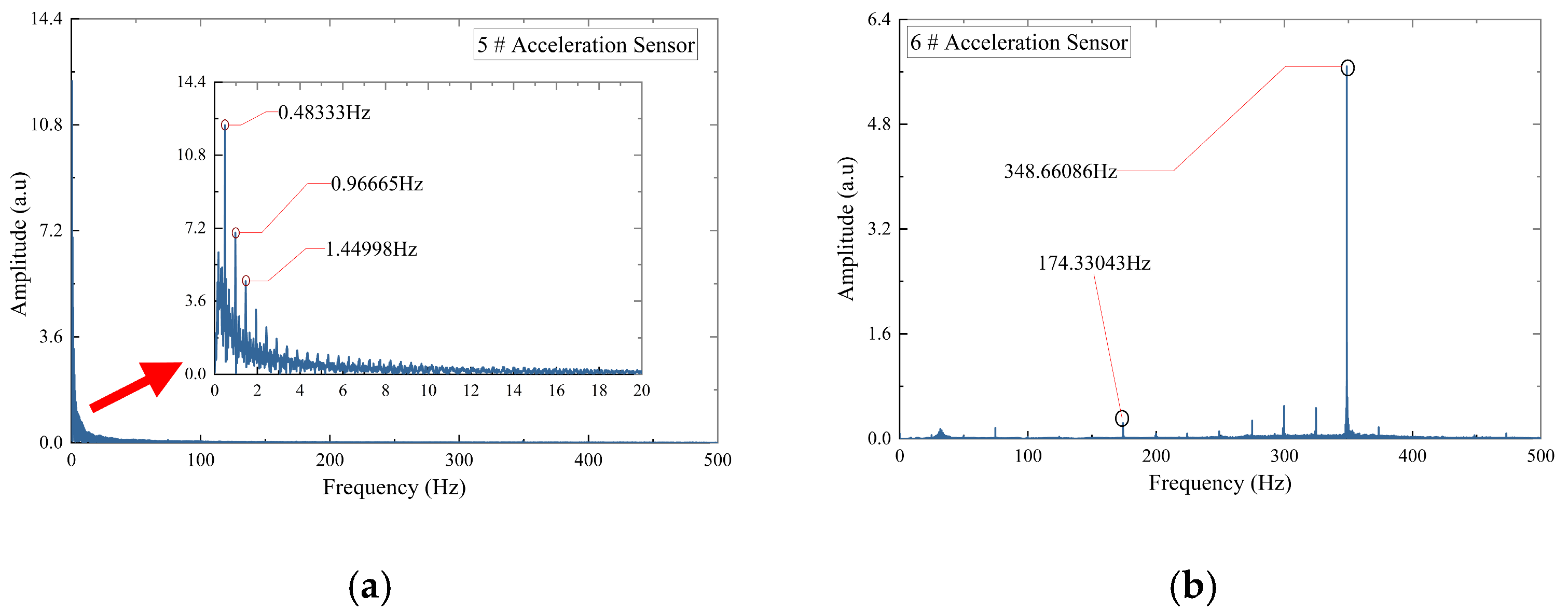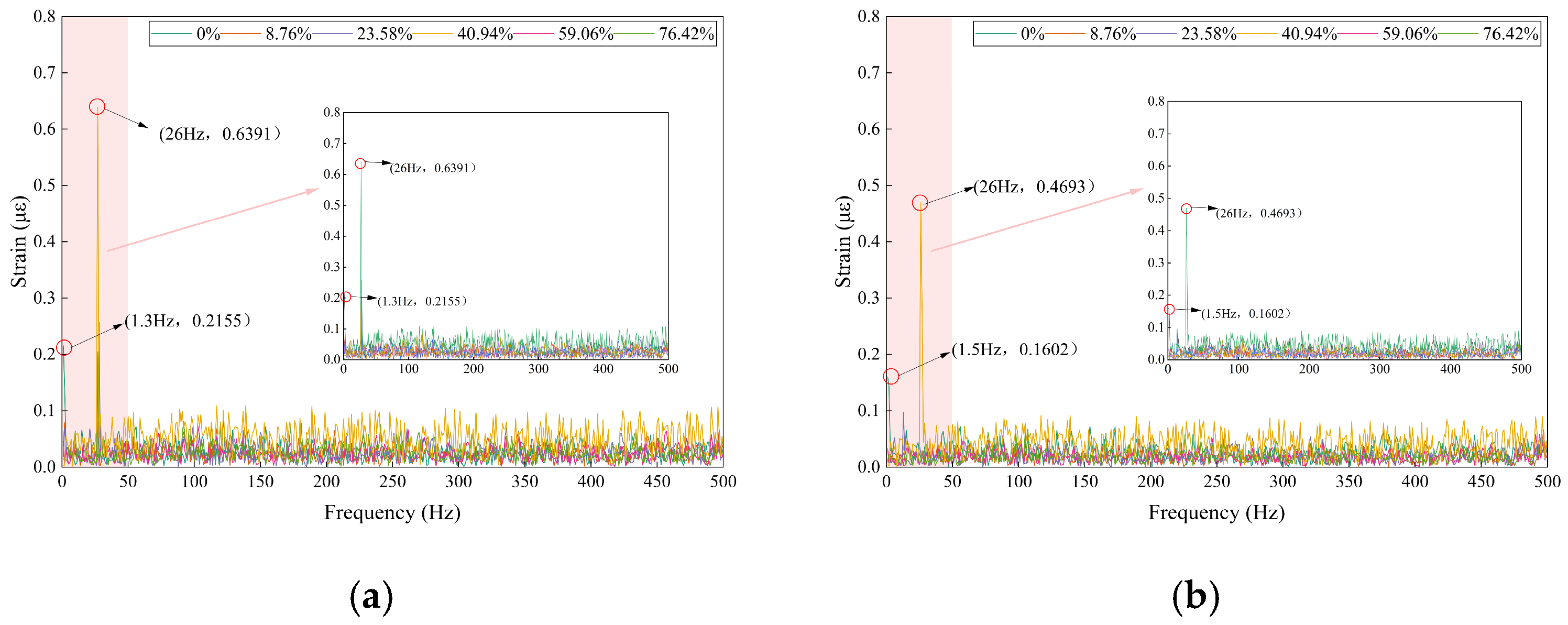 The fast Fourier transform (FFT) was applied to the FBG strain signals, with the results presented in
