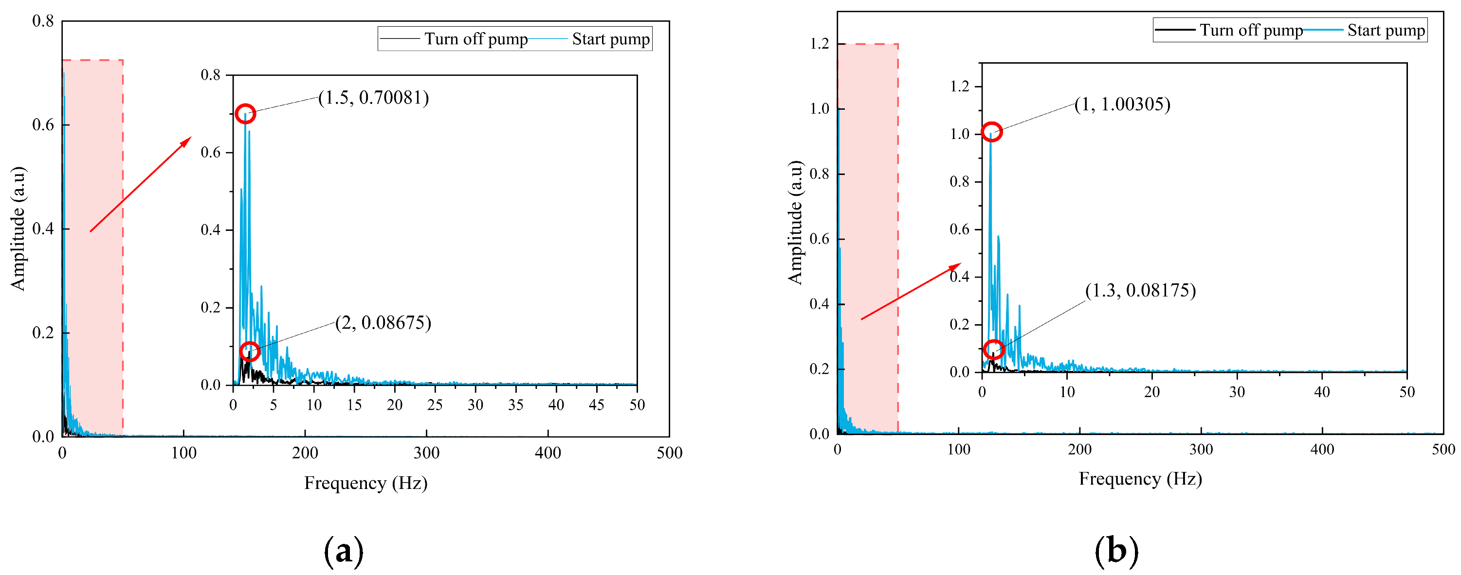 In the absence of blockage, only a low-frequency background peak near 1.5 Hz is observed in the frequency spectrum, with amplitudes of 0.2155 με and 0.1602 με before and after the blockage point, respectively. This observation corresponds to the 1–2 Hz low-frequency band in the DAS frequency domain and reflects the fundamental excitation effect of grouting pump vibration. Furthermore, this peak remains unaffected by the degree of blockage and serves exclusively as a background signal for the system, confirming the inherent vibration stability of the test equipment.