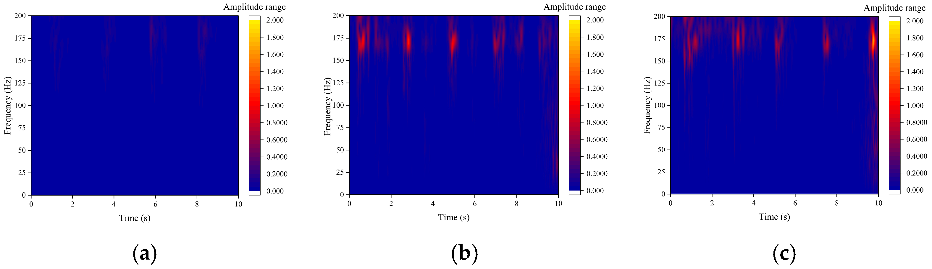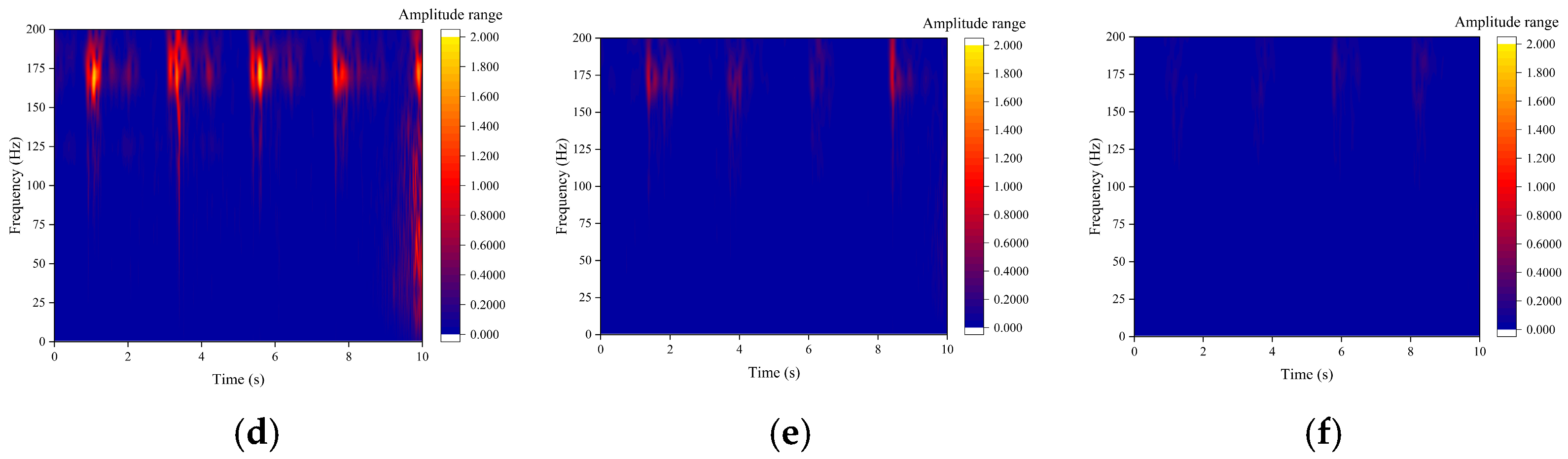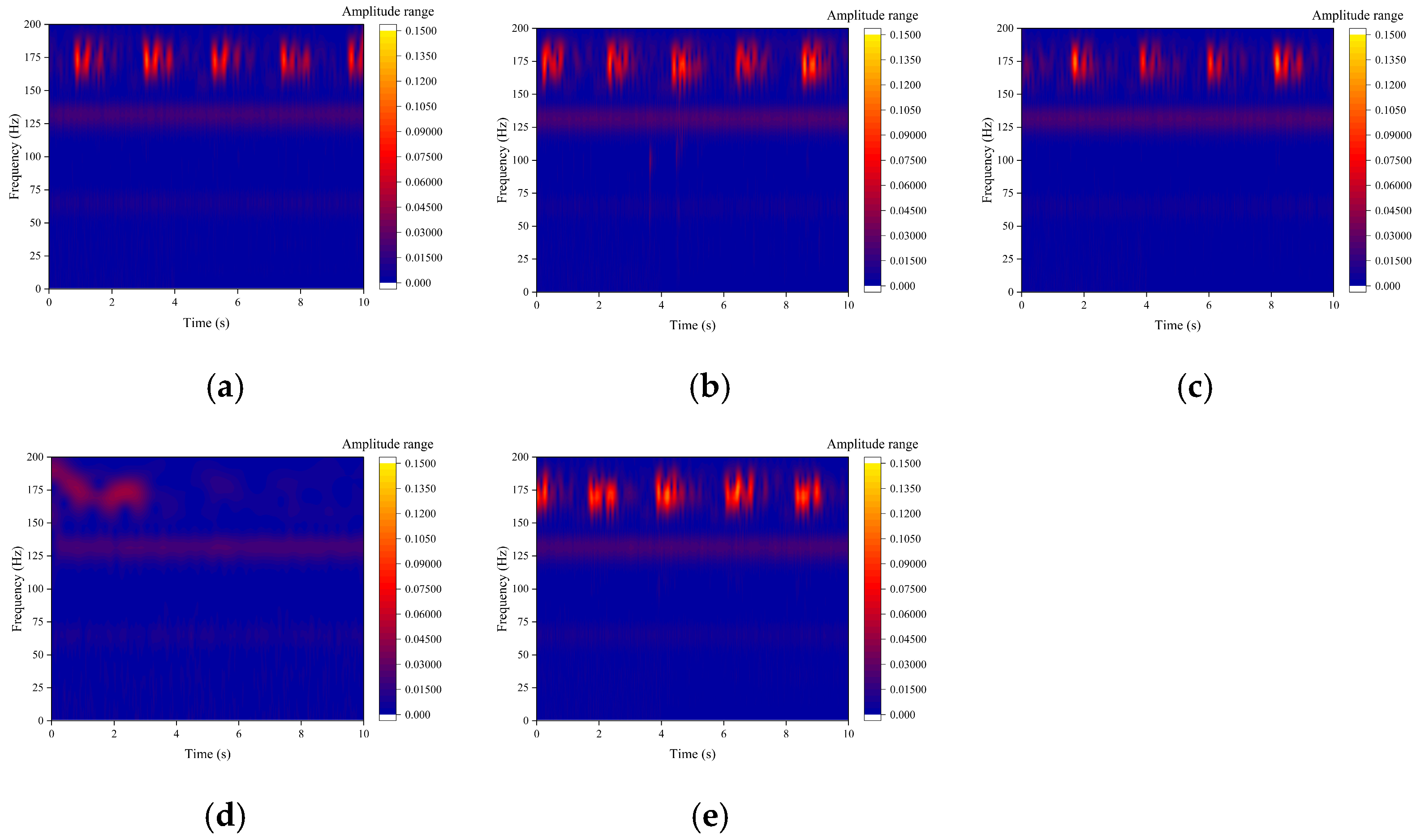 Figure 13a), the time–frequency diagram shows a uniform energy distribution with very low amplitude and no distinct characteristic frequencies. In contrast, the blocked state (